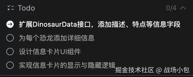 - Todo 拆解的非常合理,清晰。把复杂琐碎的需求拆解成合理、清晰的需求,点赞