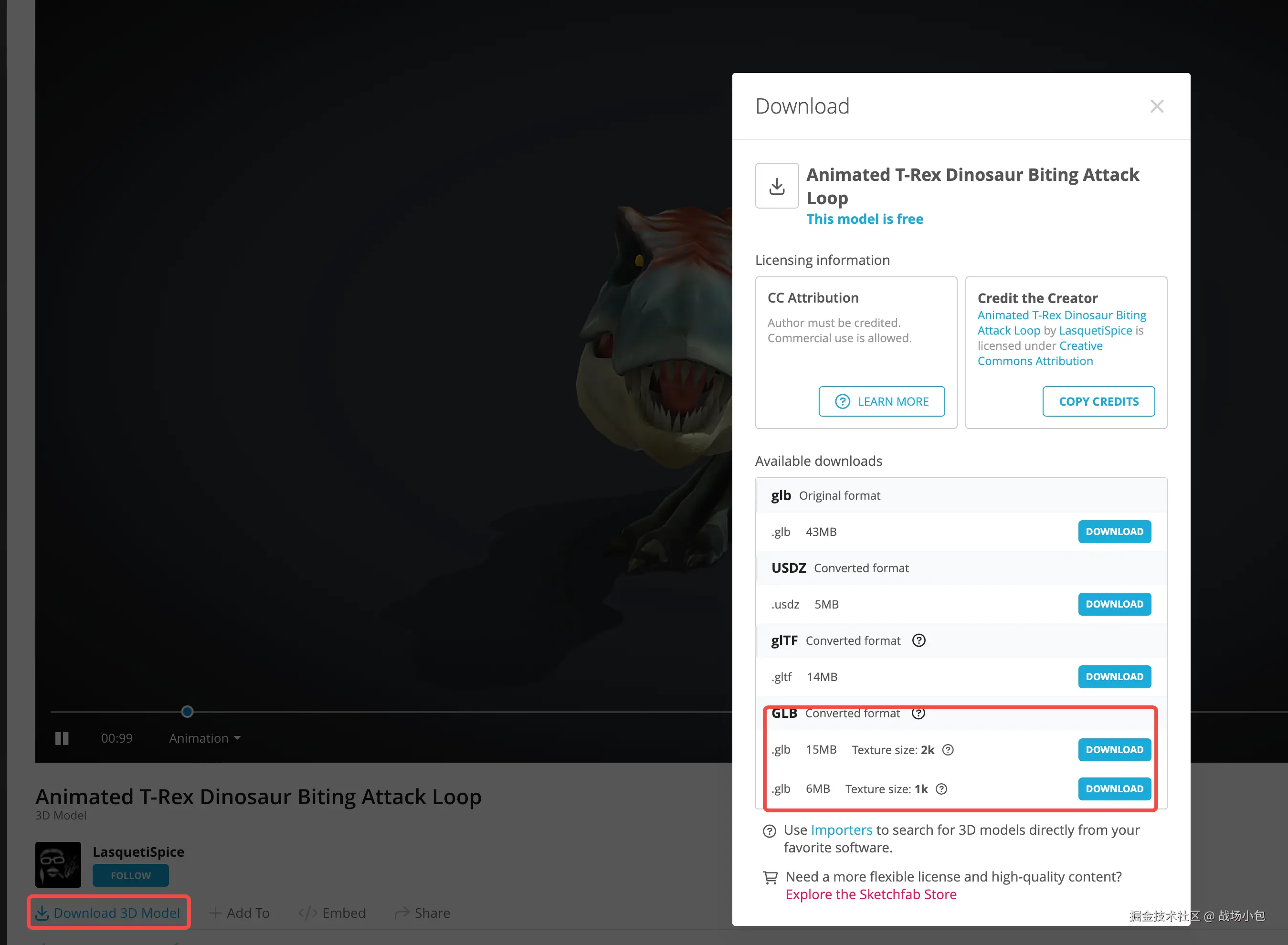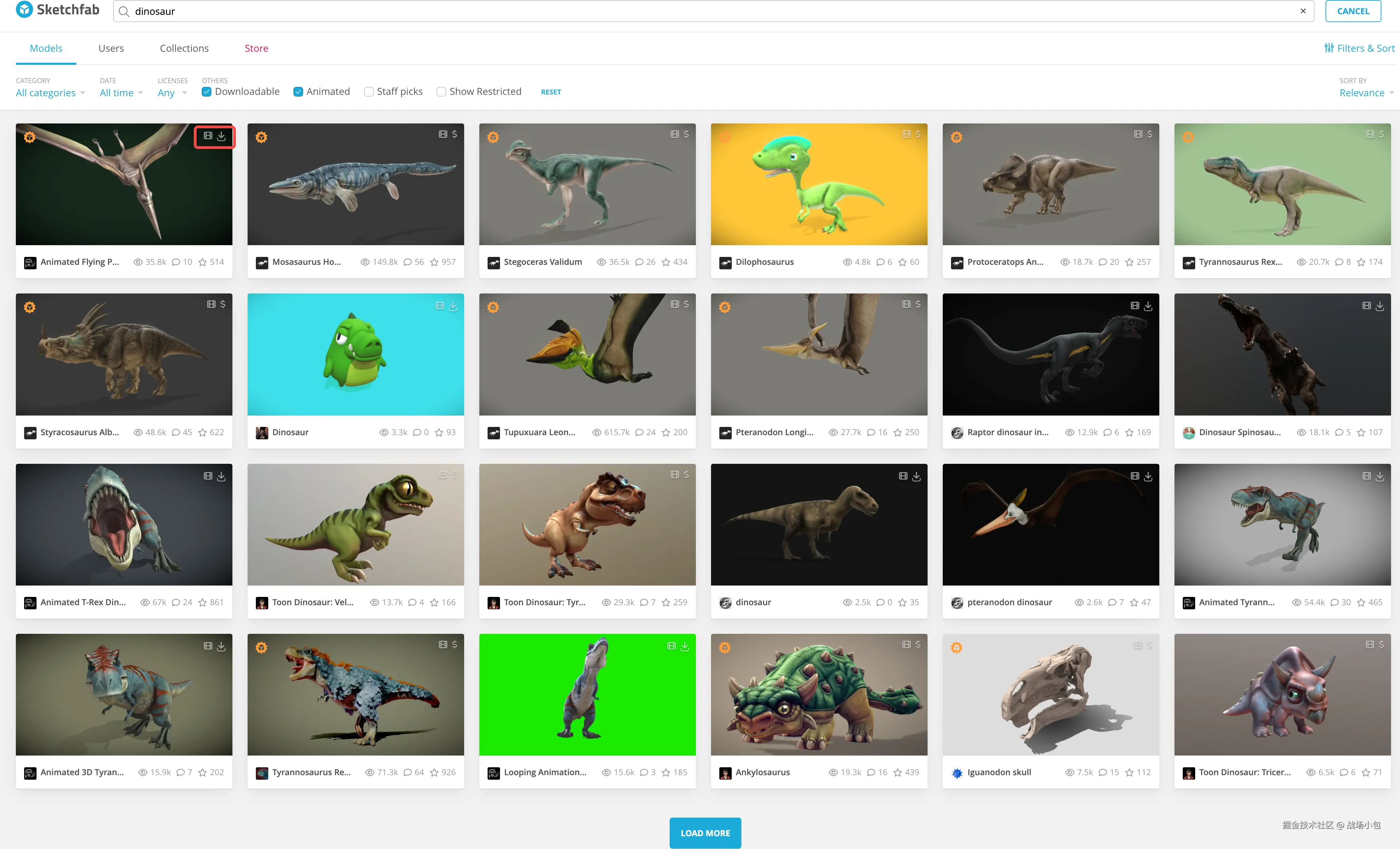 这里比较推荐 sketchfab,从里面下载一下,恐龙的模型非常多, porsche_taycan 模型相对少一些,而且还不够精美。