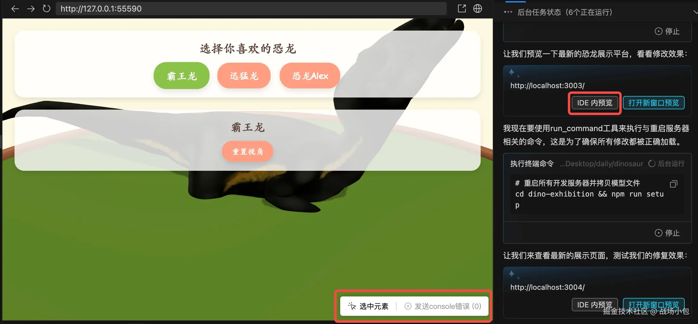 还真有!除了能正常的预览外,右下角提供了选择元素和发送 console.log 错误的功能,可以将页面中的元素和错误作为 Agent 的上下文进行使用。这功能有点强啊,相当于 AI 来帮我调试。