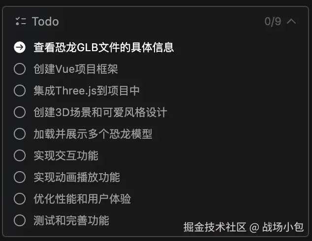 文心快码 3.5S 会首先规划要做的事,将上面的笼统且复杂的任务拆解成 9 个清晰的 todo,看到这里,小包心中大定
