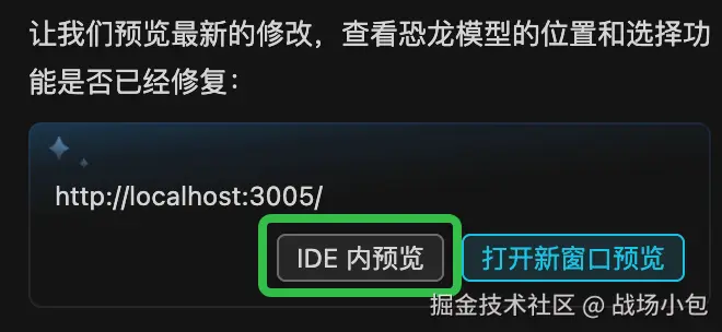 这时候发现文心快码 3.5S一个超强的功能,爱了。文心快码 3.5S 提供 IDE 內预览的能力,正如你所想,就是在 IDE 中打开网页,进行预览。