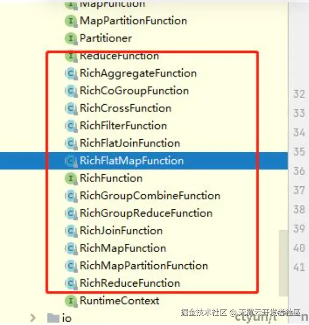在flink中,对不同的算子提供了一个Rich的版本(富函数),比如RichMapFunction、RichReduceFunction等。这类函数一般比常规函数具有更多功能,比如其可以获取运行环境的上下文、拥有着自己的生命周期。一般地,其生命周期在与数据库连接、任务状态保持功能中非常重要,与数据库连接的数据源功能一般都会使用富函数对连接状态进行保持。