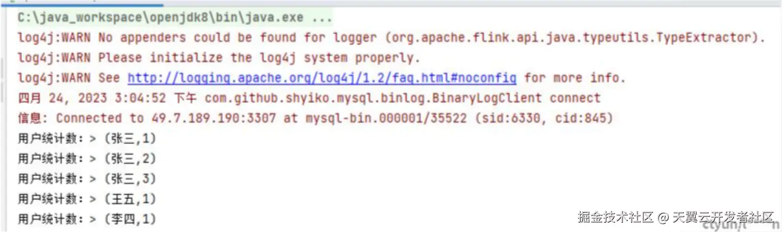 package cn.ctyun.demo.api.watermark;import cn.ctyun.demo.api.utils.TransformUtil;import com.alibaba.fastjson.JSONObject;import com.ververica.cdc.connectors.mysql.source.MySqlSource;import com.ververica.cdc.connectors.mysql.table.StartupOptions;import com.ververica.cdc.debezium.JsonDebeziumDeserializationSchema;import org.apache.flink.api.common.eventtime.SerializableTimestampAssigner;import org.apache.flink.api.common.eventtime.WatermarkStrategy;import org.apache.flink.streaming.api.datastream.DataStream;import org.apache.flink.streaming.api.datastream.DataStreamSource;import org.apache.flink.streaming.api.environment.StreamExecutionEnvironment;import java.time.Duration;/*** @classname: ViewContentStreamWithoutWaterMark* @description: 浏览记录数据源不包含水位线* @author: Liu Xinyuan* @create: 2023-04-14 13:47**/public class ViewContentStreamWithoutWaterMark { public static DataStream<JSONObject> getViewContentDataStream(StreamExecutionEnvironment env){ // 1.创建Flink-MySQL-CDC的Source MySqlSource<String> viewContentSouce = MySqlSource.<String>builder() .hostname("******") .port(3306) .username("******") .password("******") .databaseList("test_cdc_source") .tableList("test_cdc_source.user_view") .startupOptions(StartupOptions.initial()) .deserializer(new JsonDebeziumDeserializationSchema()) .serverTimeZone("Asia/Shanghai") .build(); // 2.使用CDC Source从MySQL读取数据 DataStreamSource<String> mysqlDataStreamSource = env.fromSource( viewContentSouce, WatermarkStrategy.noWatermarks(), "ViewContentStreamNoWatermark Source" ); // 3.转换为指定格式 return mysqlDataStreamSource.map(TransformUtil::formatResult); }}