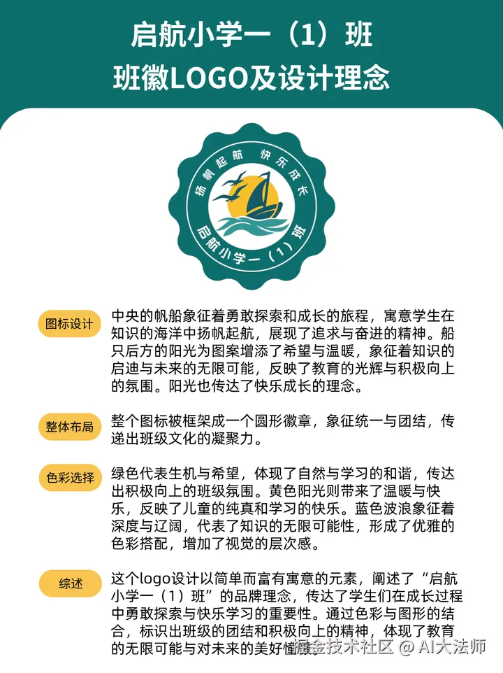 12、启航小学一(1)班的班徽 LOGO 及设计理念。班徽中央帆船象征学生在知识海洋扬帆探索、奋进成长,后方阳光增添希望温暖,寓意知识启迪与未来可能;整体为圆形徽章,象征统一团结,传递班级凝聚力;色彩上绿色代表生机希望,黄色阳光带来温暖快乐,蓝色波浪象征知识无限可能。该设计以简洁元素阐述班级品牌理念,传达学生勇敢探索、快乐学习的重要性,体现班级团结和积极向上精神,以及教育的无限可能与对未来的美好憧憬。