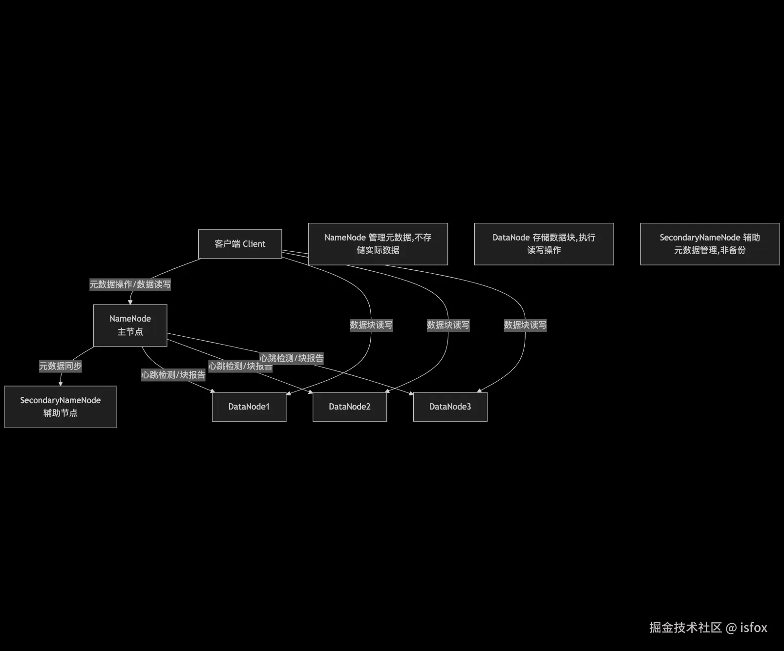 HDFS 采用 主从架构(Master-Slave),由三个核心组件构成:NameNode、DataNode 和 SecondaryNameNode。