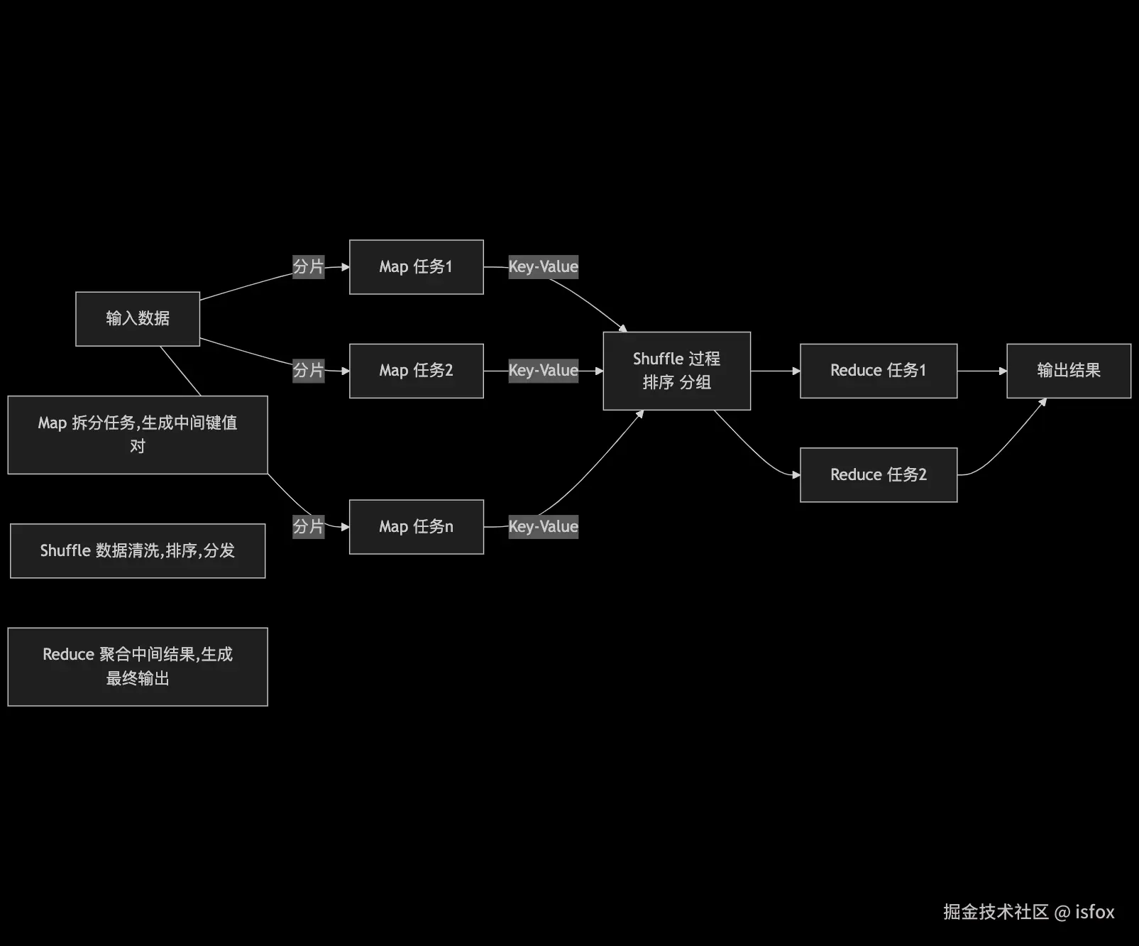 - Reduce 阶段:接收 Shuffle 后的中间结果,聚合计算并输出最终结果。