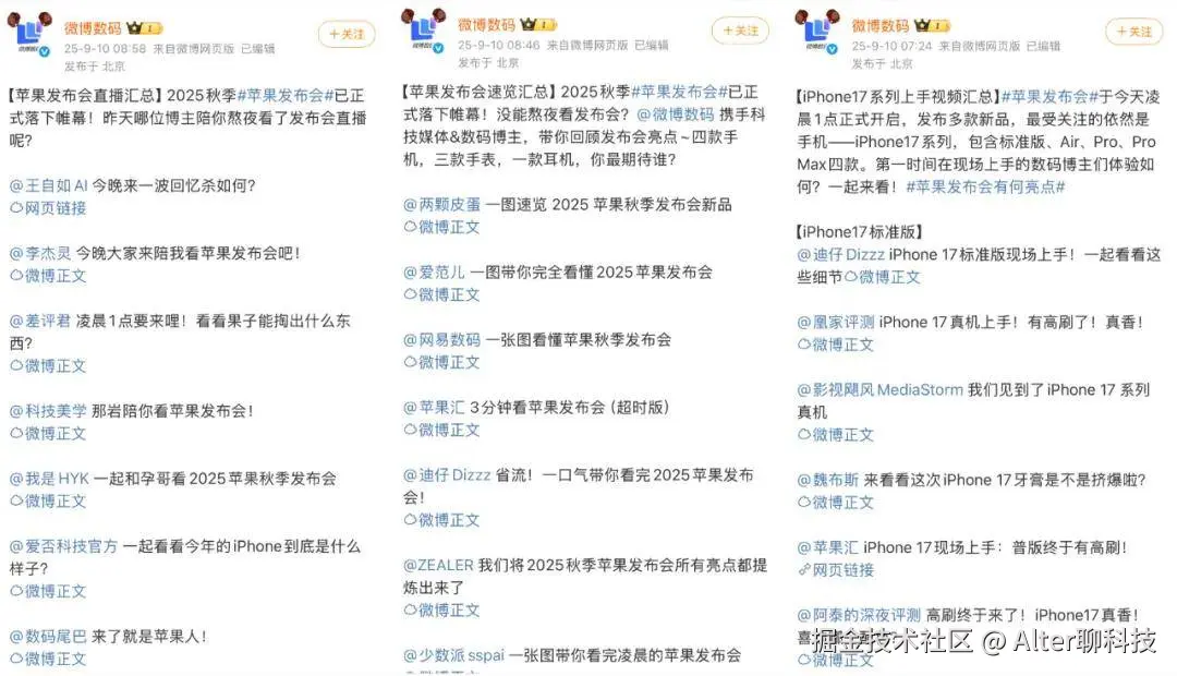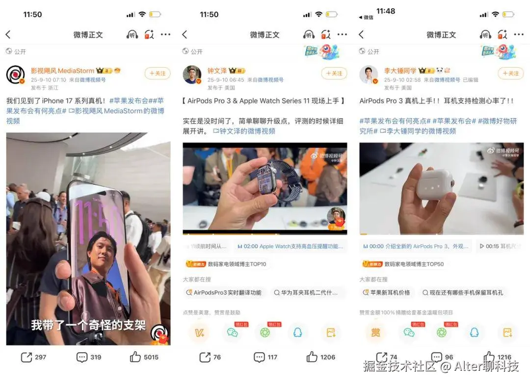其中微博数码在苹果发布会前一天就组织了“大V报道团”,和多位KOL连线实时解读发布会内容;在发布会结束后,送上了一波长图和视频“速览”,并针对iPhone 17系列、新款Apple Watch、AirPods Pro 3等产品第一时间输出了上手视频和专业解读。