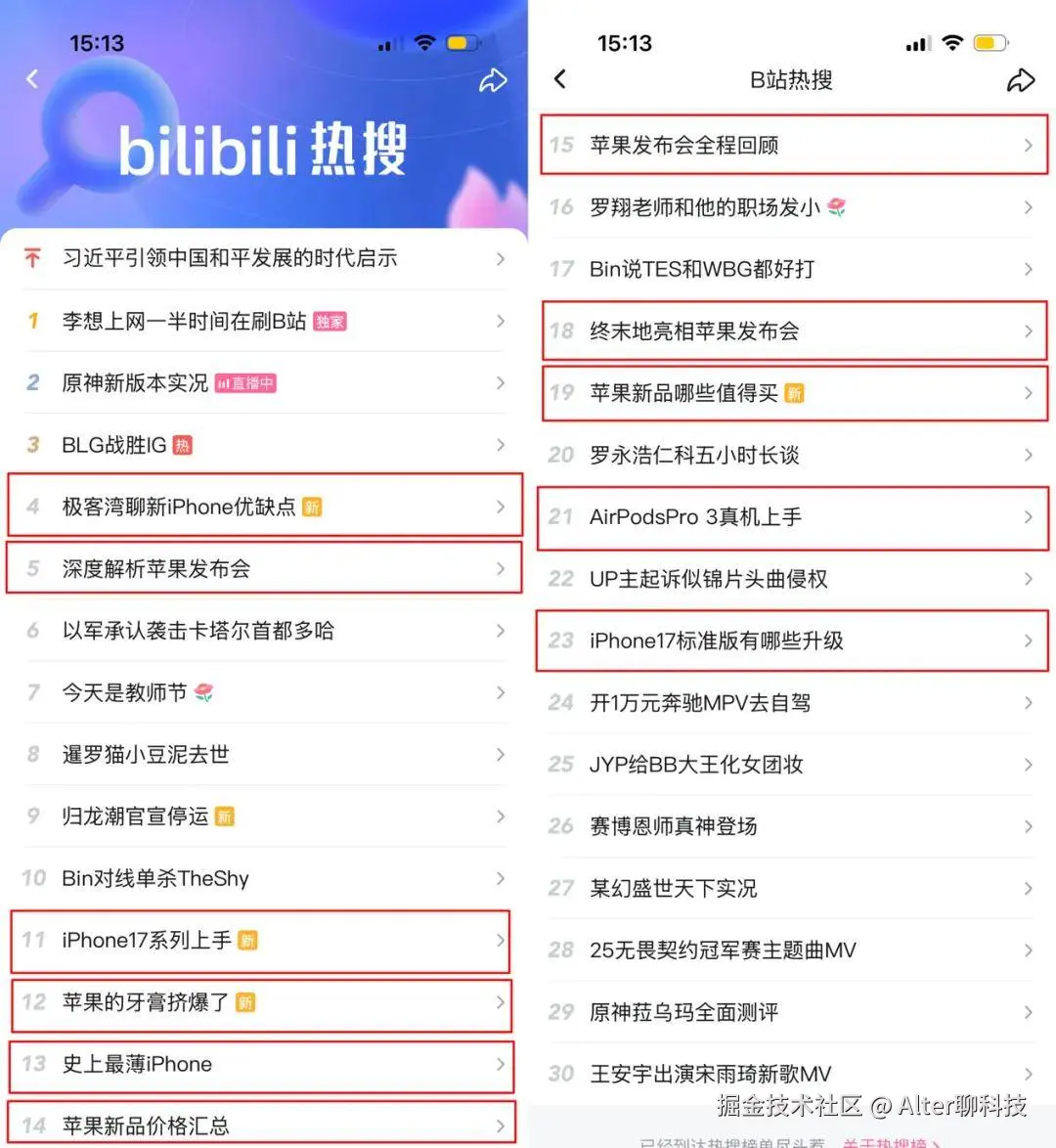 B站热搜呈现出了“苹果发布会”霸榜的态势,相关话题占比超过了三分之一,包括深度解析、上手体验、价格汇总等不同维度。B站的话题衍生和跨圈能力稍弱,但“圈内”的技术浓度和质量极高,维持了更长时间的关注度,也让UP主有时间去打磨内容。