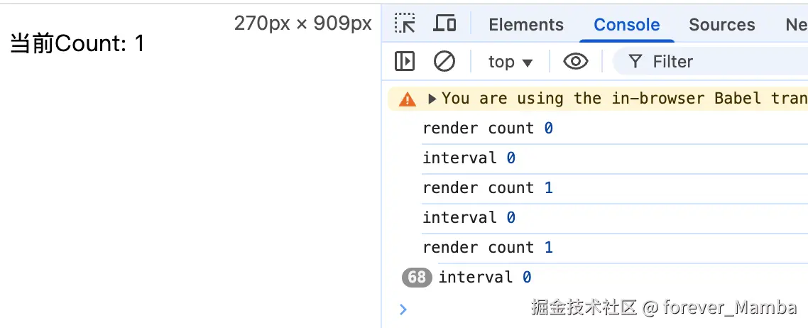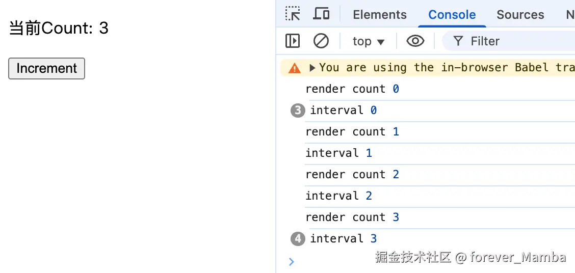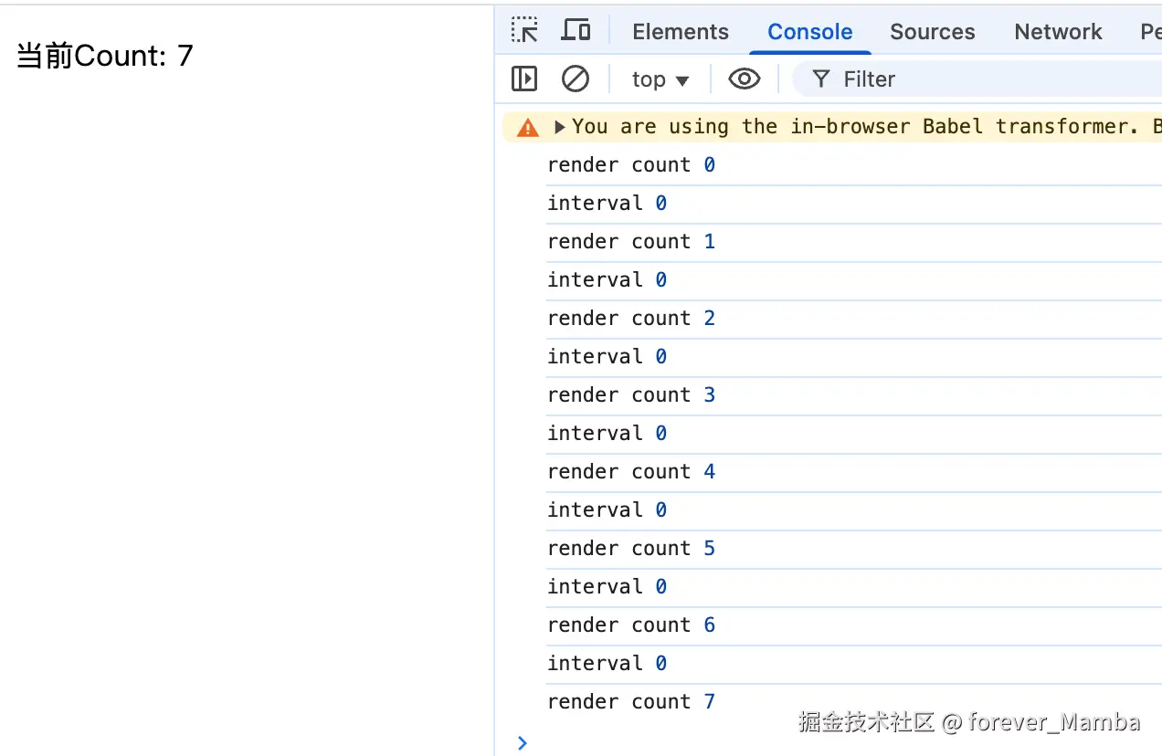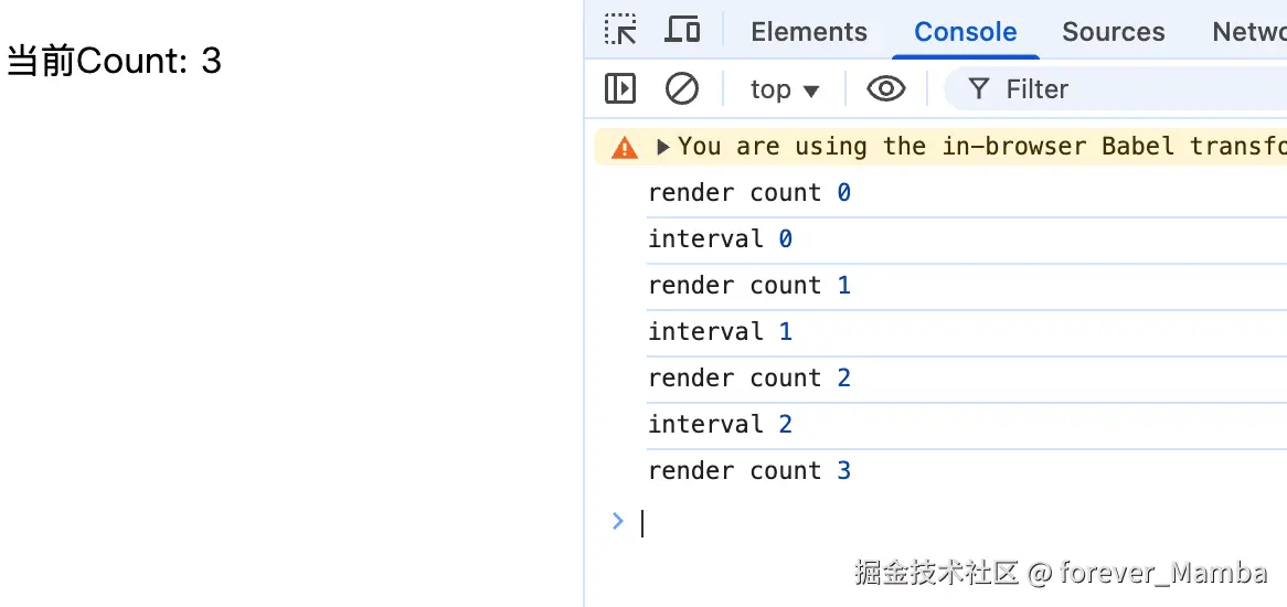 可以看到以下的执行结果,在 setInterval中拿到的 count 始终是初始化的值。