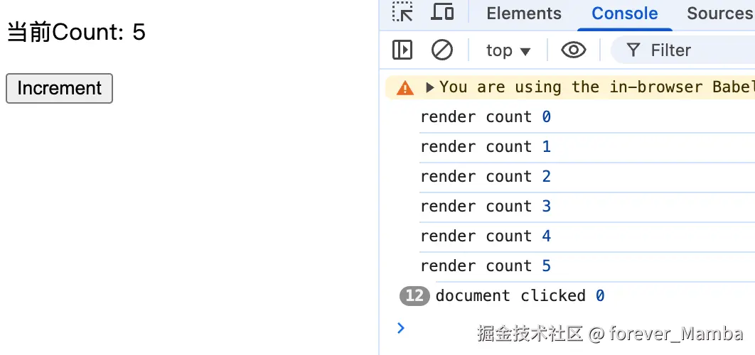 执行结果如下:多次点击按钮更新count的值,后续点击document的事件,始终获取的是count初始值