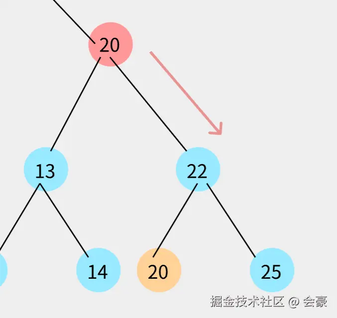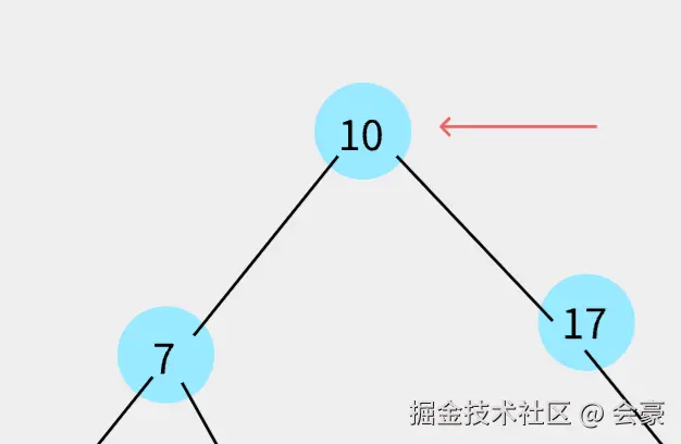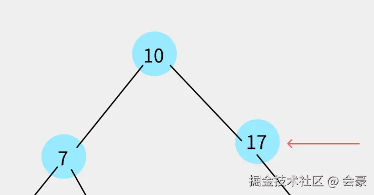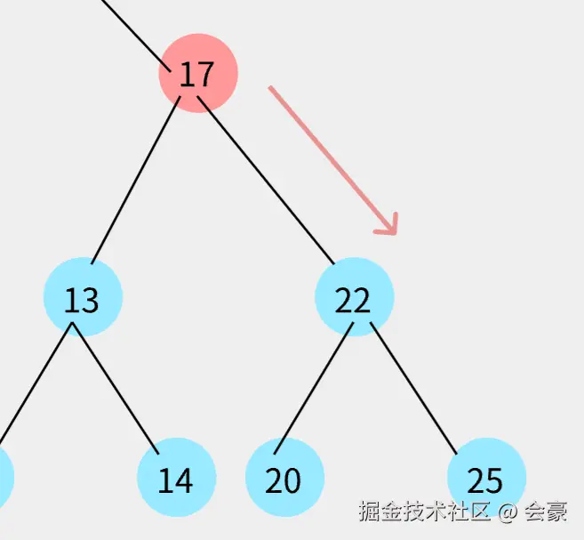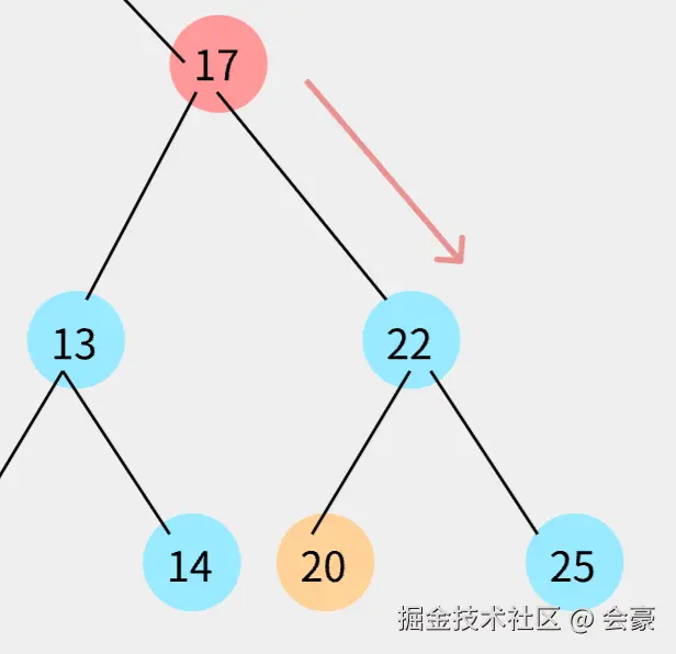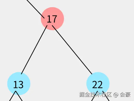 发现比13 比17小,然后就13就需要和17的左指针指向的节点进行比较,但是呢,17左指针为null,所以就将17左指针直接指向13