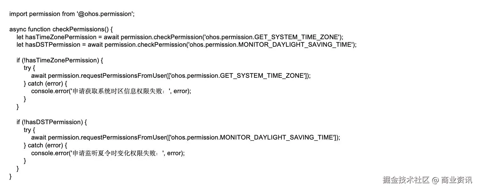 ·通过这种方式,确保应用在具备相应权限的情况下进行时区和夏令时相关操作,避免因权限问题导致功能异常。同时,合理向用户解释申请权限的原因,提高用户授予权限的意愿。