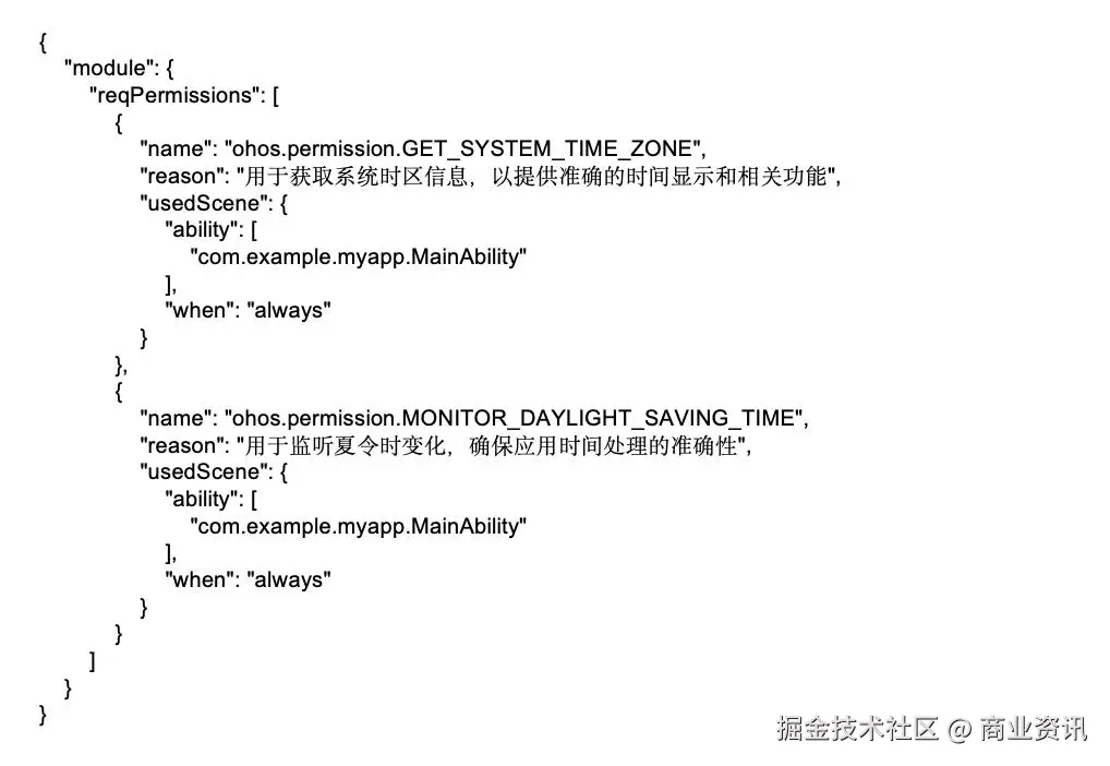 ·在应用的权限声明中,明确申请所需的时区和夏令时相关权限。例如,在应用的 config.json 文件中添加权限声明: