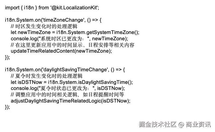 ·鸿蒙系统可能提供了监听时区和夏令时变化的事件机制,开发者可以注册相关监听器,在系统时区或夏令时发生变化时及时收到通知。例如: