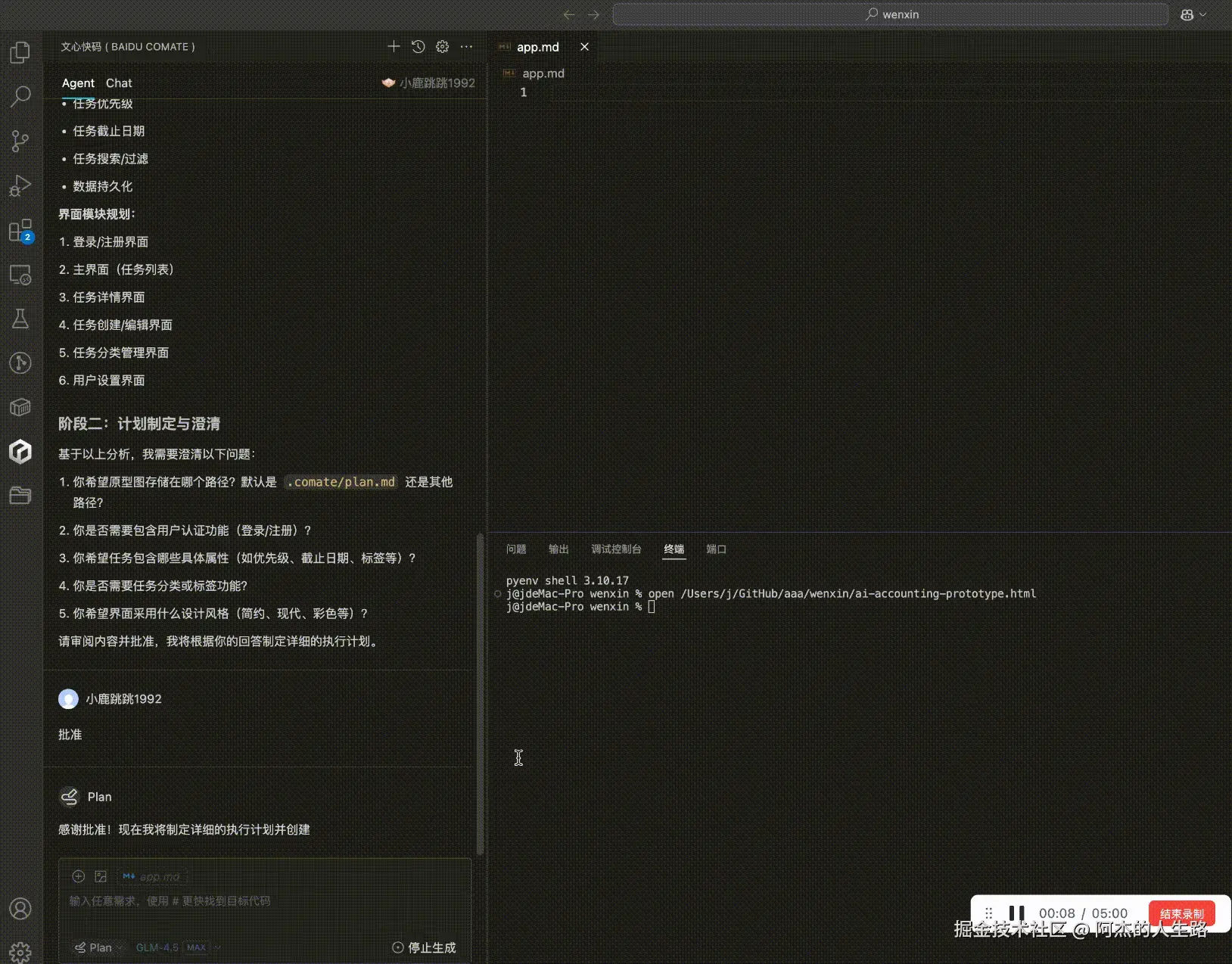 文心快码 3.5S 版本通过多智能体协同,真正实现了 “AI 开发团队” 的概念。它不再是简单的代码生成工具,而是能够深度理解业务需求、自主规划开发步骤、协同完成复杂任务的智能伙伴。在 AI 自动记账 APP 开发实战中,从需求分析生成原型,到技术架构设计、代码编写、测试优化,文心快码全程提供高效辅助,将原本需要 30 天的开发任务缩短至 12 天,同时大幅提升了代码质量与项目稳定性。
