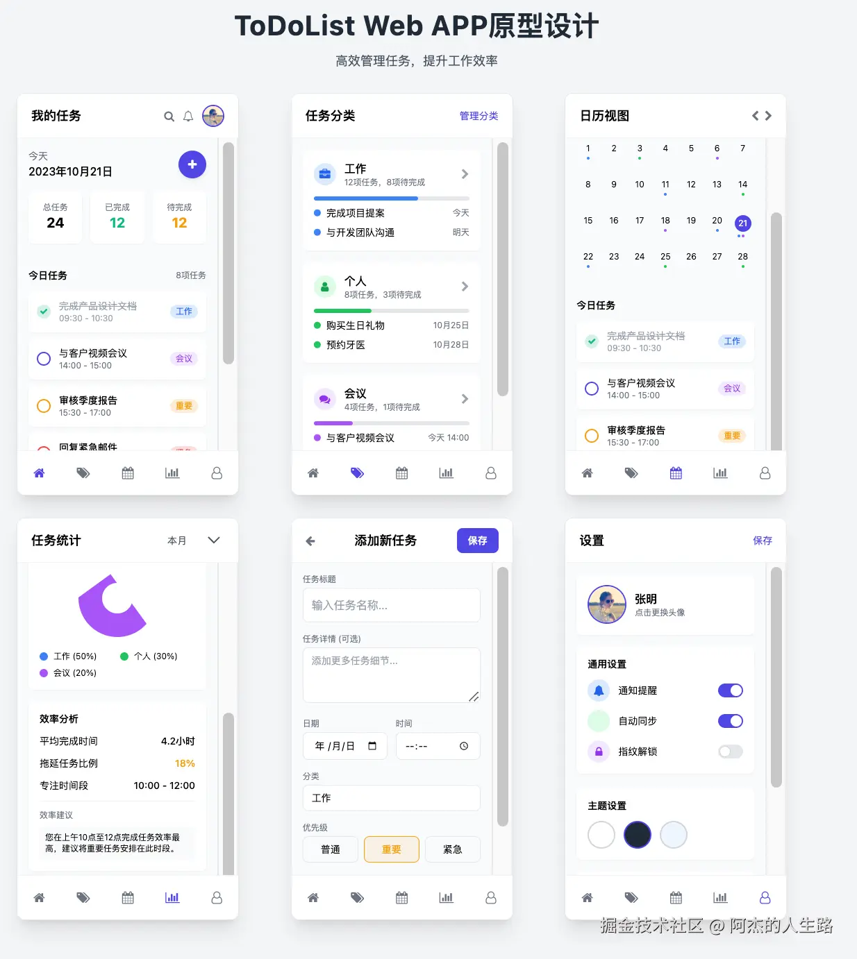 基于 prototype.html 实现的现代化移动端 UI 设计,开发一个功能完整的 ToDoList Web APP。包含 6 个核心页面:任务首页、分类管理、日历视图、统计分析、添加任务和个人设置。采用 Tailwind CSS 框架,实现响应式设计和优雅的用户体验。