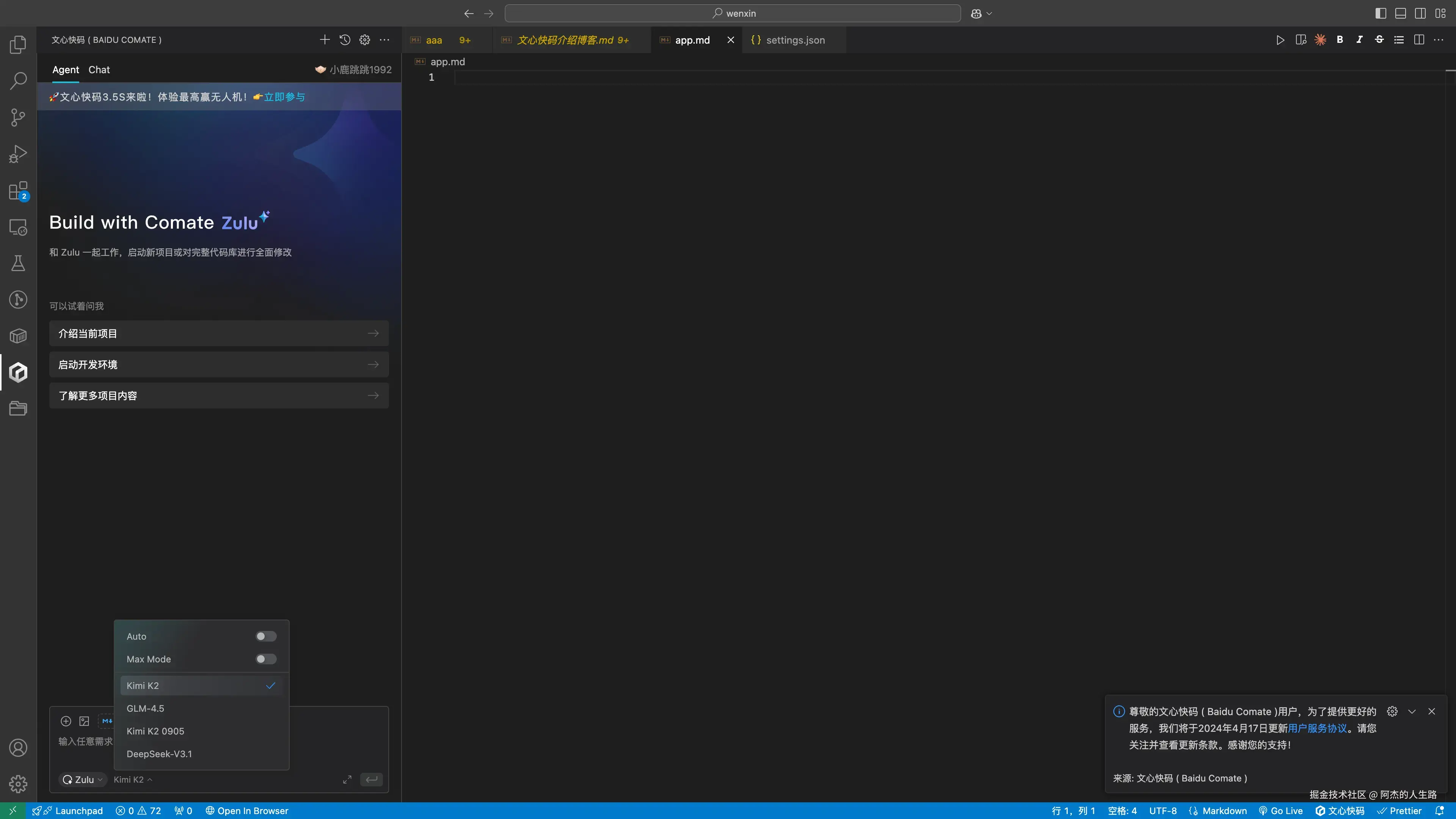 点击 文心快码 插件 打开面板,底部模型默认是 auto ,可以选择自己想使用的模型。支持的 K2 GLM DeepSeek, 其中 k2 支持 MAX 模式,其实操作跟其他AI编译器都类似,就是对话然后沟通开发需求,接下来我以一个 ToDoList Web APP 页面为例子来演示一下使用方式和操作过程。