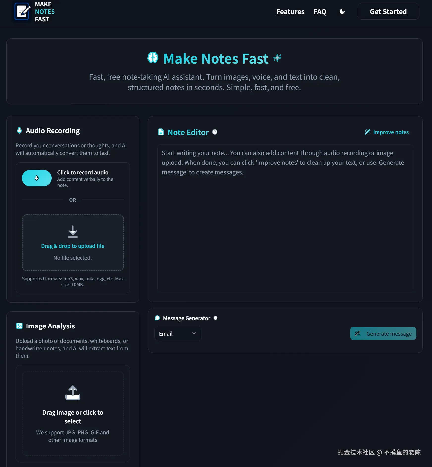 Make Notes Fast是一款免费的在线工具,可以将图片和语音转换为可编辑的文本,无需注册。