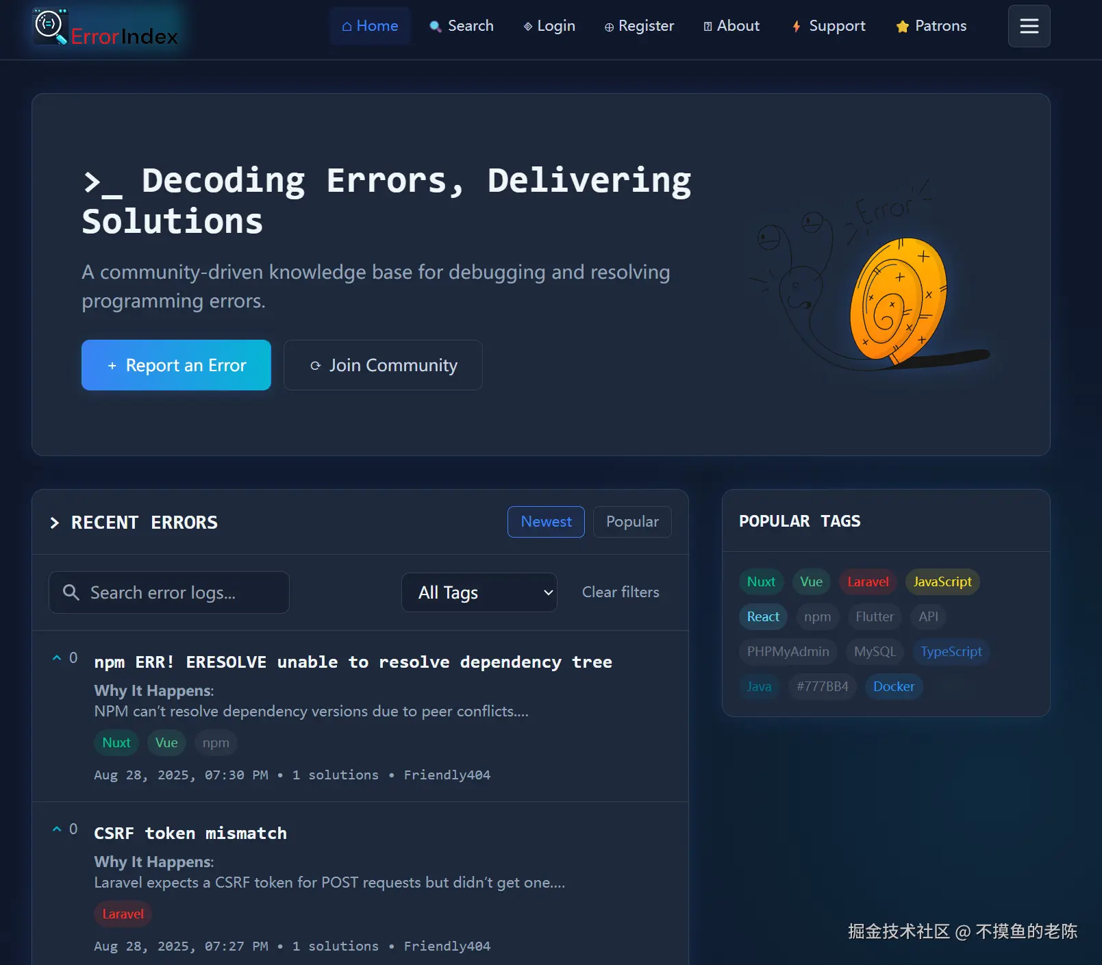 ErrorIndex是一款社区驱动的编程错误和解决方案库,允许用户发布遇到的错误并分享有效的解决方案,旨在为开发者提供一个集中记录和查找错误的地方。