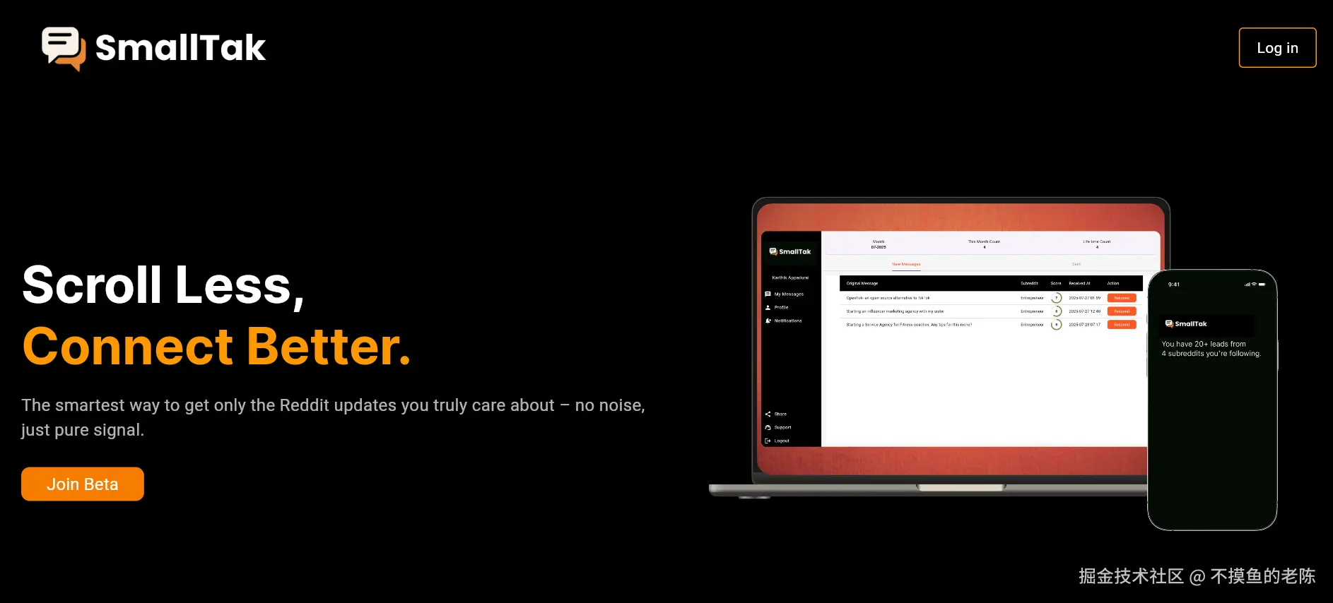Smalltak是一款帮助用户跟踪多个Reddit子版块的工具,查找与产品/服务/个人资料匹配的消息并预填充回复。