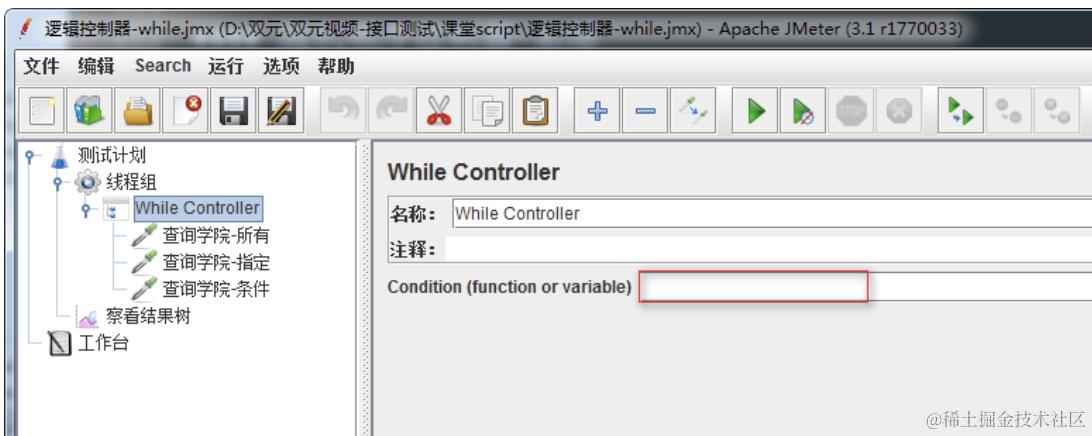 线程组下有3个查询学院请求[所有、指定、条件],使用While控制器无限循环执行下去。