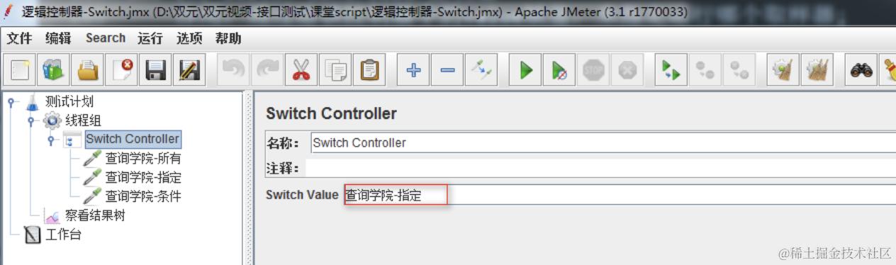 线程组下有3个查询学院请求[所有、指定、条件],使用Switch控制器控制执行指定请求。