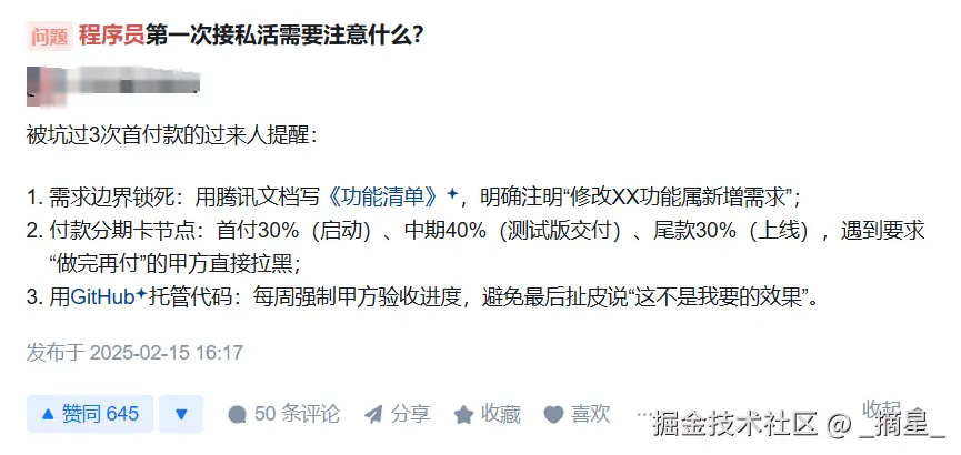 除了这些平台型网站,一些技术社区也是不错的外包信息来源,比如 V2EX 的“酷工作”版块、掘金的“招聘/合作”标签,经常会有个人或中小团队发出紧急需求贴。