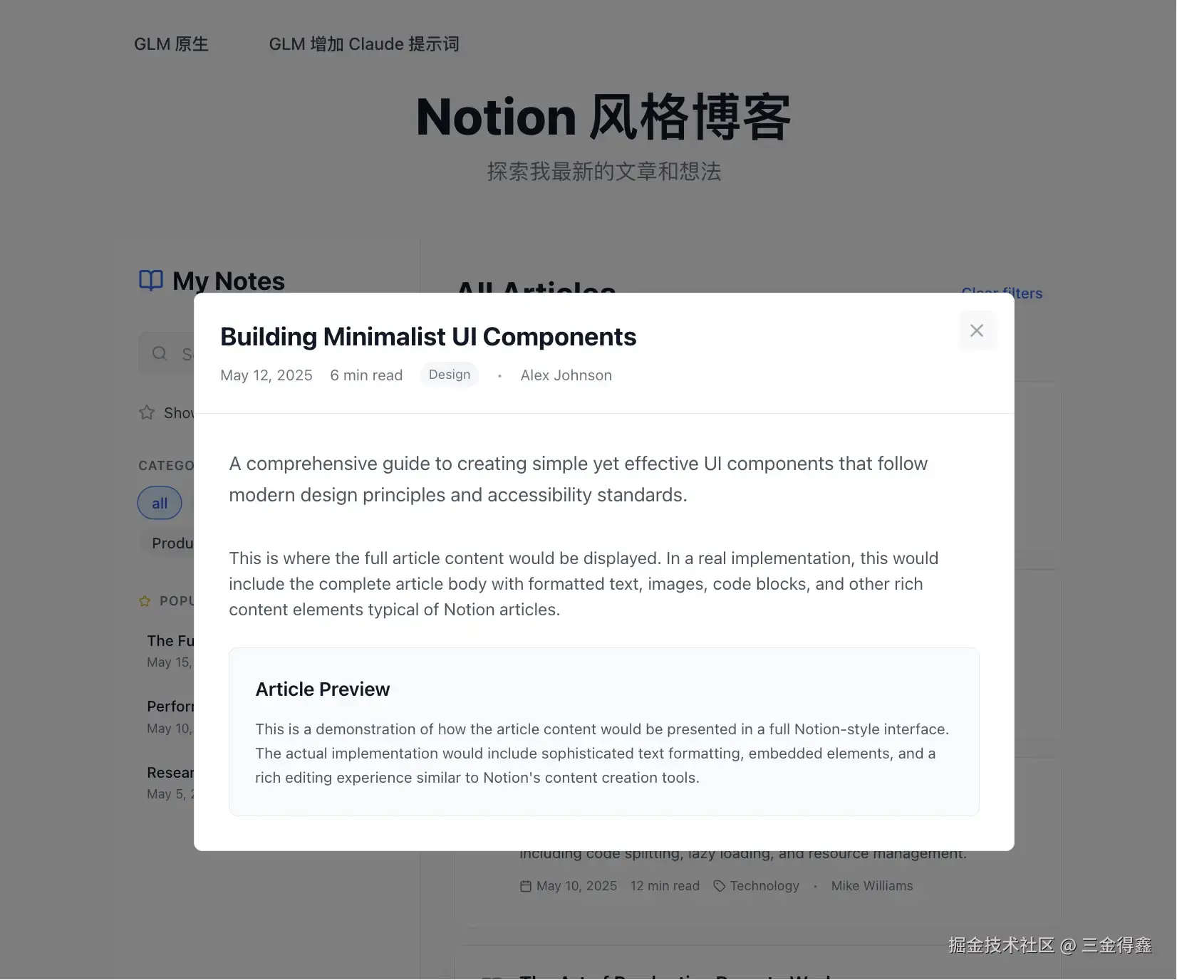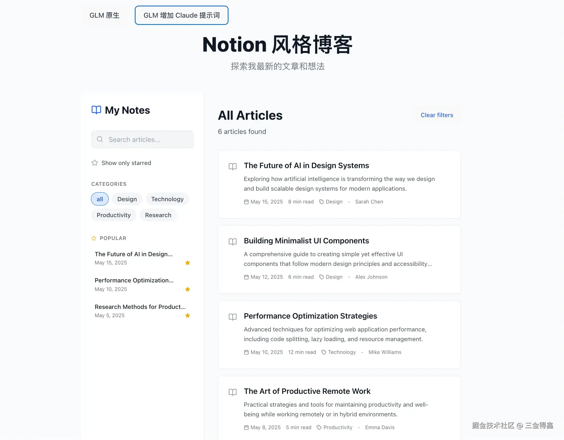 在 Cherry Studio 中新建一个名为 GLM-Claude 的助手,并给该助手设置 Claude4 的系统提示词。 最后输入相同的指令:使用 React 写一个 Notion 风格的文章列表。