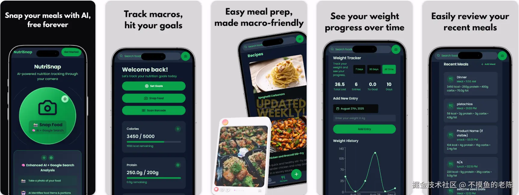 NutriSnap是一款AI驱动的营养追踪应用,用户通过拍照识别食物的营养信息,并提供条形码扫描、进度追踪和食谱功能。