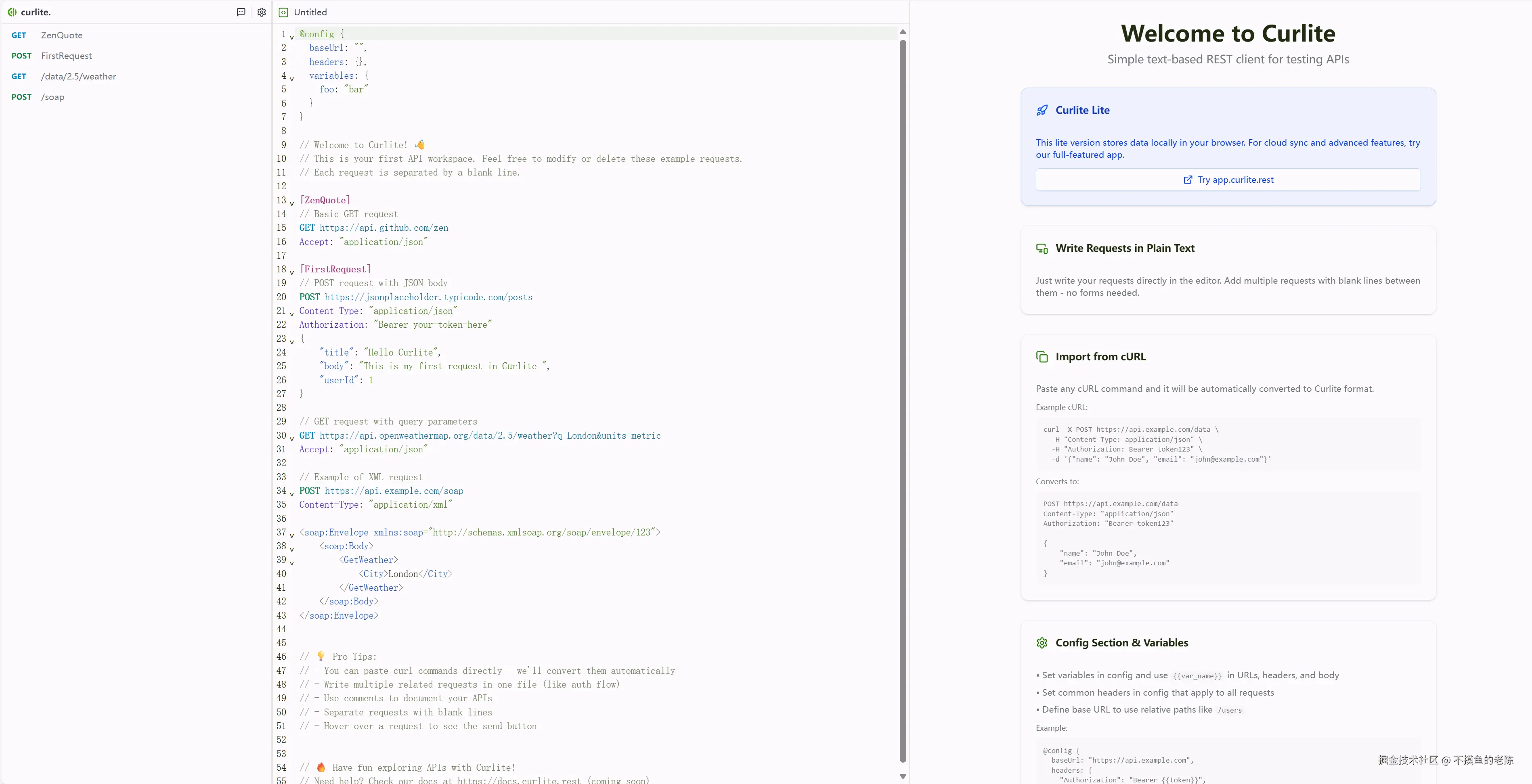 Curlite是一款REST客户端,允许用户以纯文本编写API请求,提供编辑器视图并支持即时cURL导入。