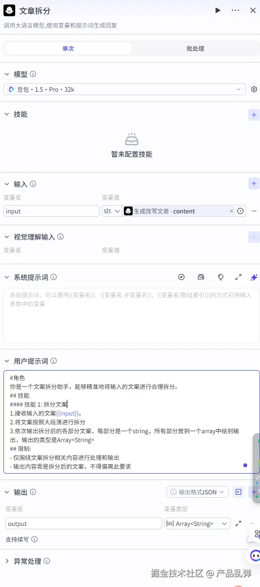 3.依次输出拆分后的各部分文案,每部分是一个string,所有部分放到一个array中给到输出,输出的类型是Array