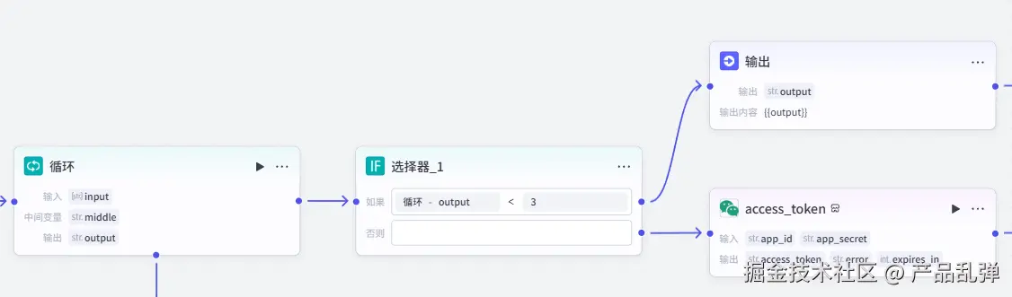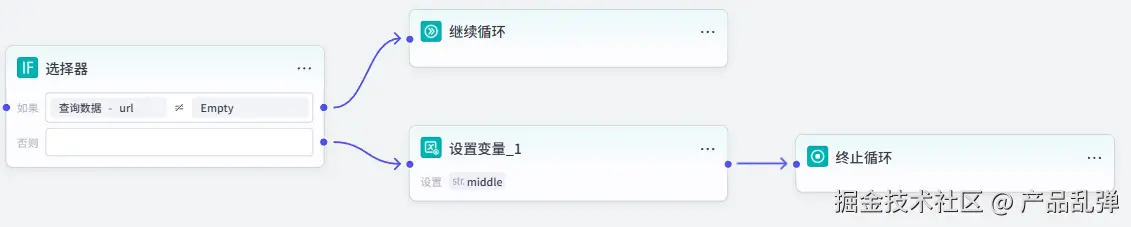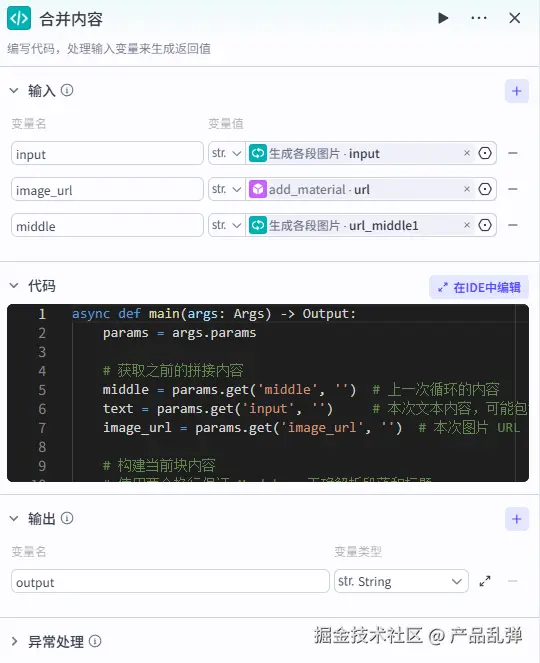 【重点】本步骤是重点!!!通过之前的节点,我们得到了一段文章内容和一张传入素材库的图片链接,接下来我们要把这两个内容进行合并,并与上一次循环已合并好的内容共同合并,存储到中间变量 middle 中,再进入下一次循环(有点绕,可以想象你在做一本相册,每次循环就像得到一张照片(image_url)和一段说明文字(content),你会先把文字和照片贴在一起,然后把这一页贴到之前已经做好的相册后面(合并到 middle),下次再得到新的文字和照片时,重复这个过程)。源码