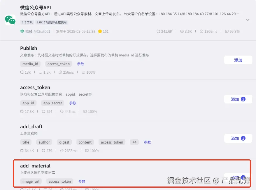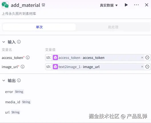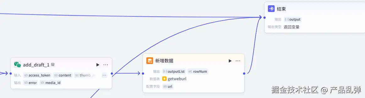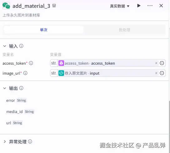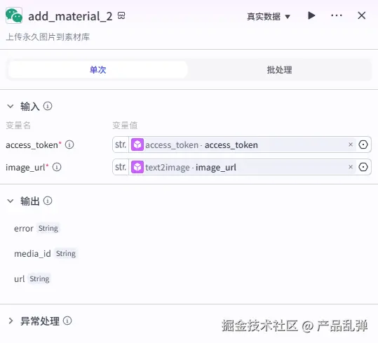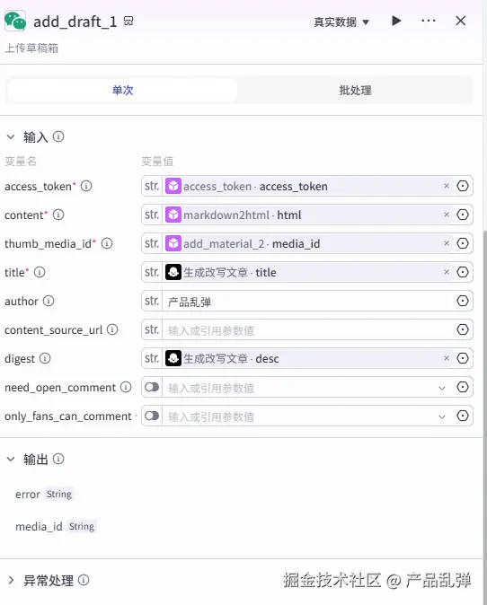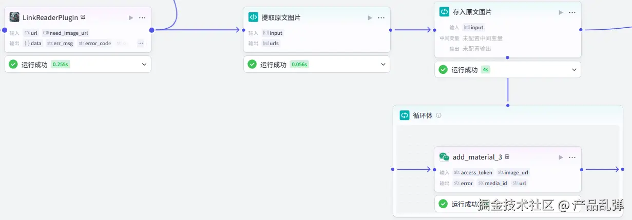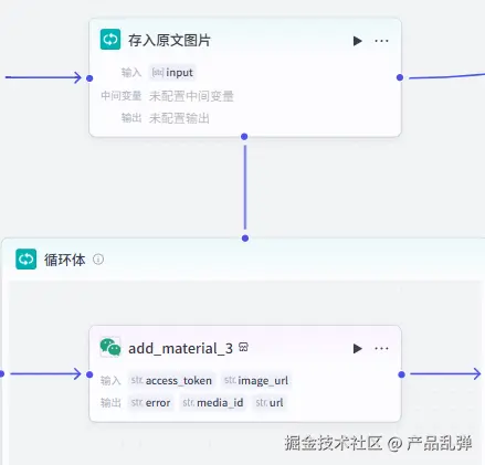 添加【循环】节点将上一节点输出的原文图片 url 数组存入公众号素材库中,后续要在文章中使用原文图片,直接从素材库添加即可,无需再进行找到原文-保存图片-上传素材库等繁琐操作。七、将文章存入公众号草稿箱并更新数据库