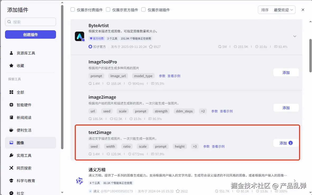 二、更换其他插件和模型,Coze还提供了其他的文生图插件,如智能绘图、Doubao图像生成等,仅需替换原来的 text2image 插件,具体效果需要不断尝试,也不在本教程范围介绍**\ **