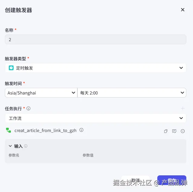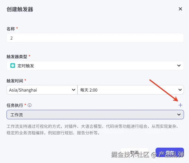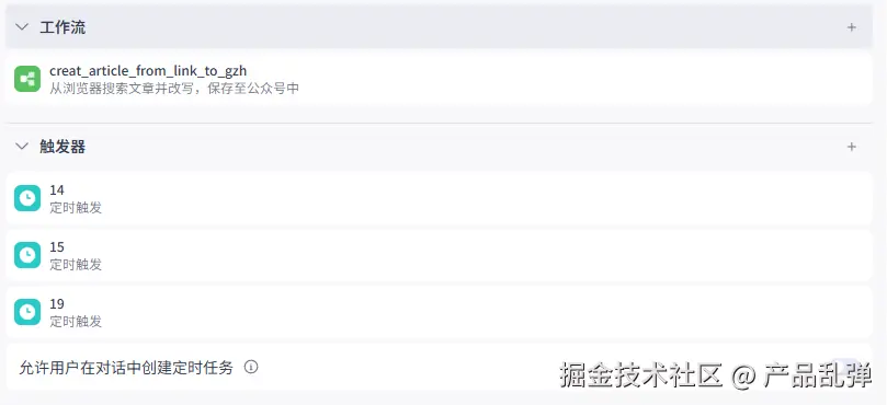 接下来要设置智能体的触发器实现定时执行工作流。1、添加工作流和触发器