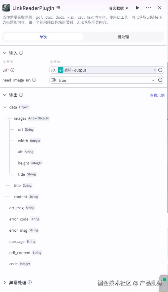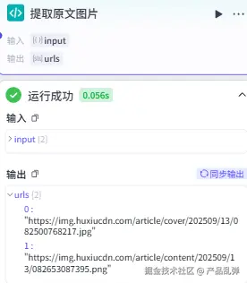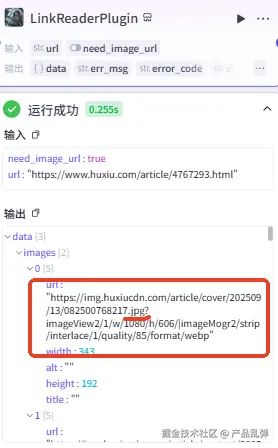 【重点】本步骤还是重点!!!我们在之前的 LinkReaderPlugin 节点中已经拿到了原文的图片地址,但是其格式无法直接使用,需要将其中的 url 提取出来,并且要对 url 的内容进行截取,只取到 .jpg / .png。输入