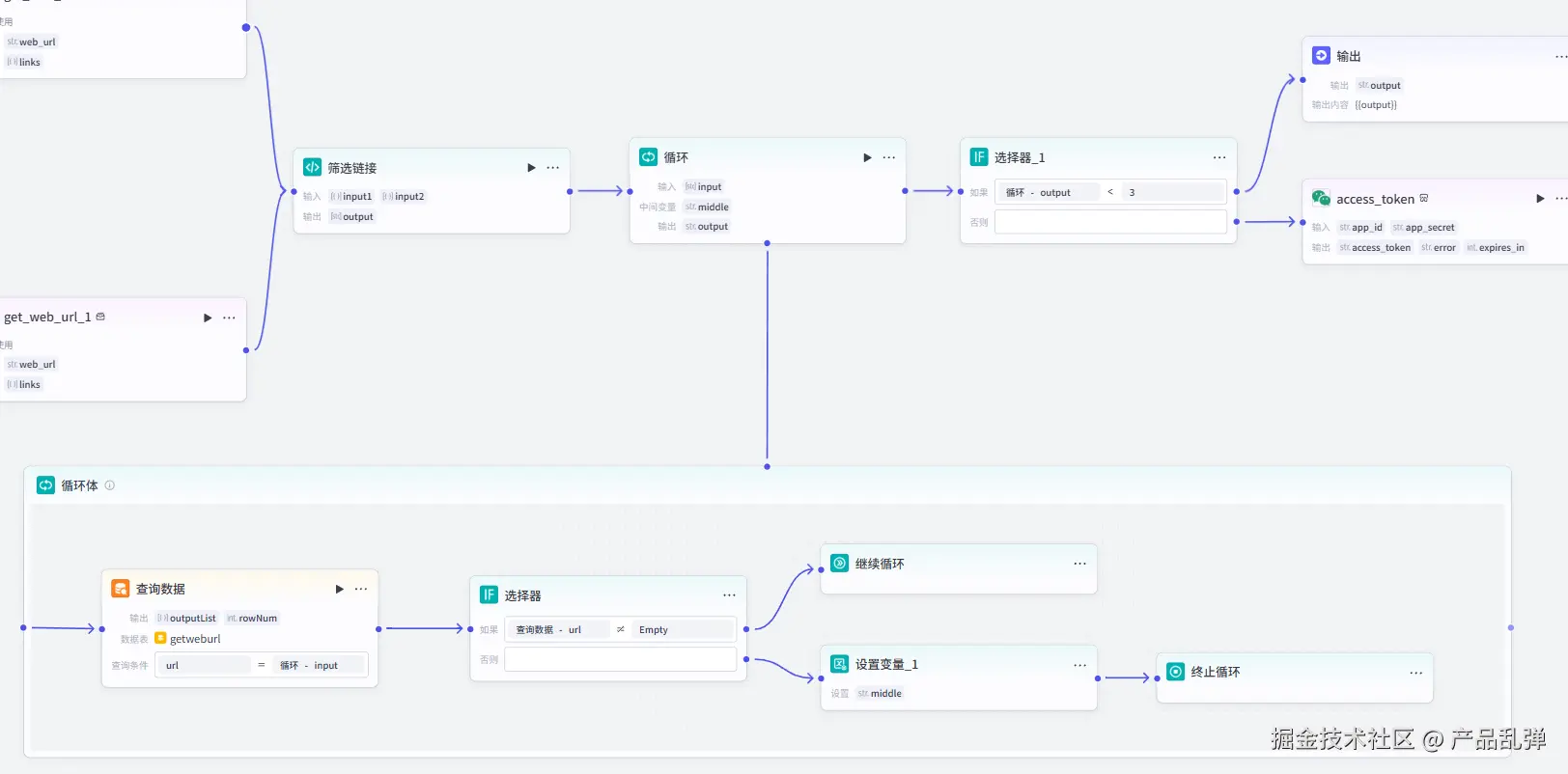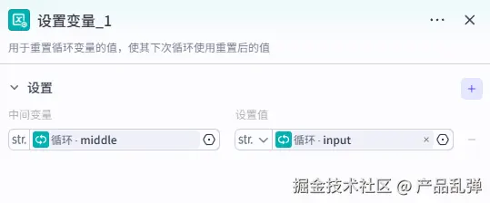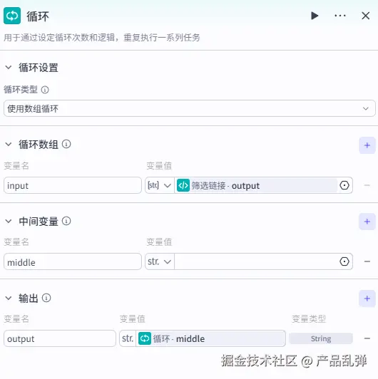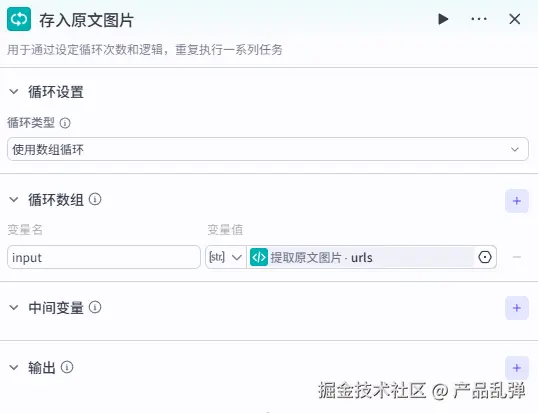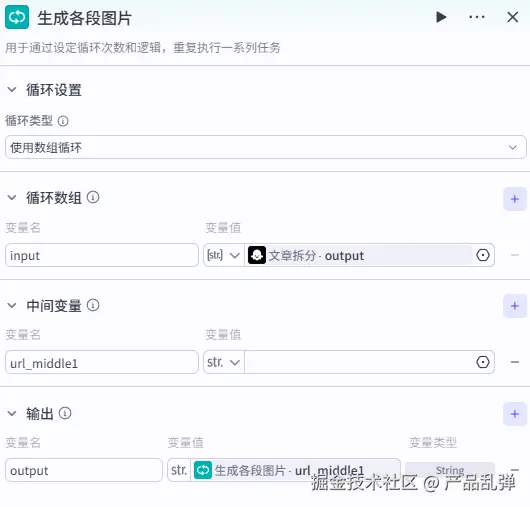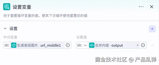 将本段内容 ipnut 和素材库的图片链接 image_url 进行合并,并将合并的结果与上一次循环的结果进行合并存入中间变量 middle 中。5、设置循环输出变量