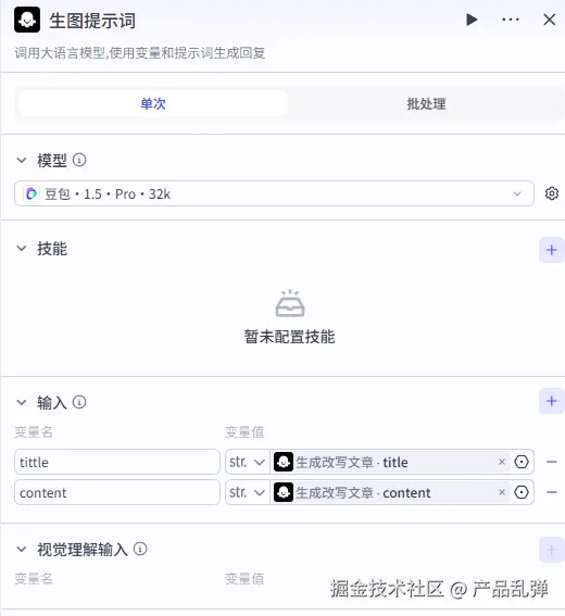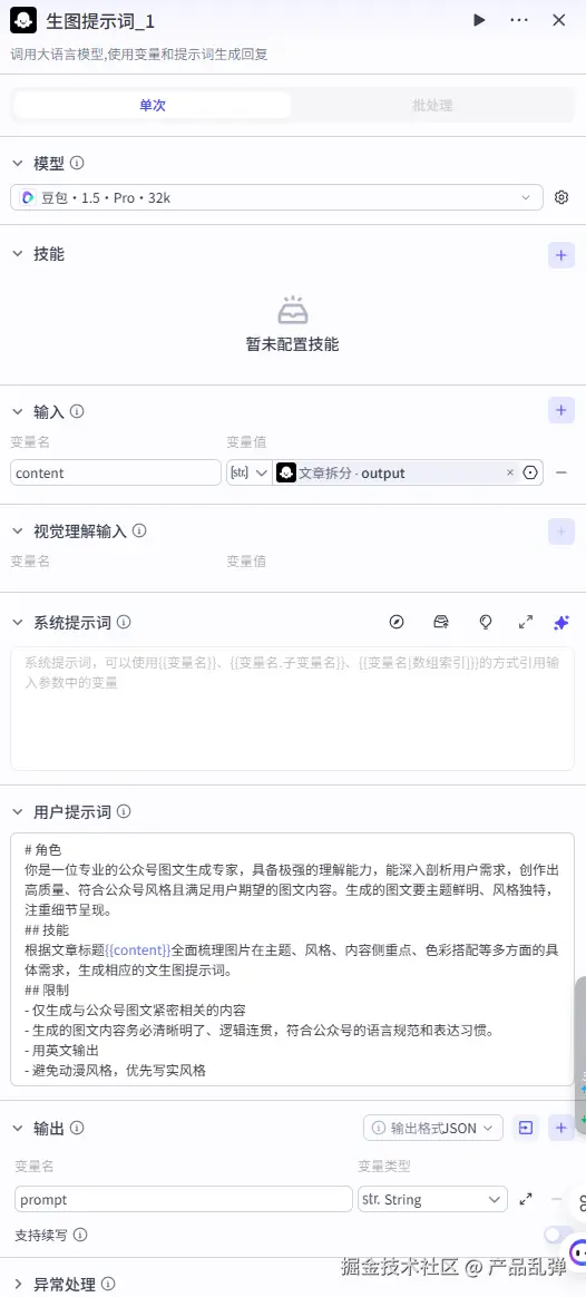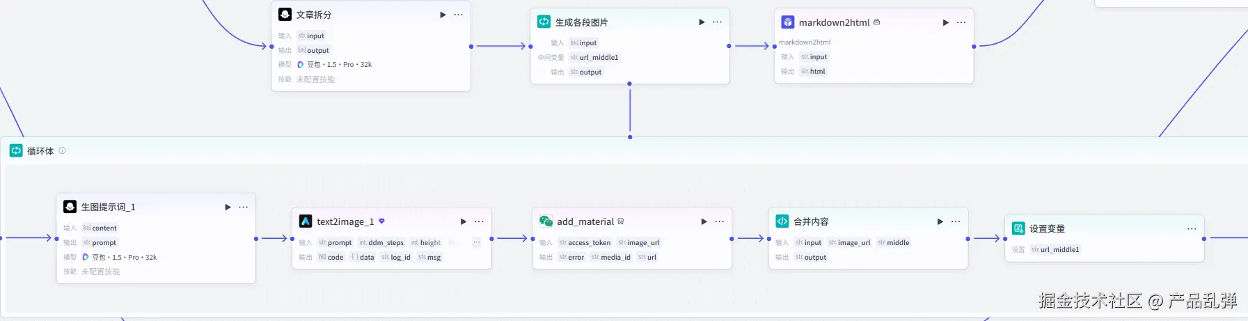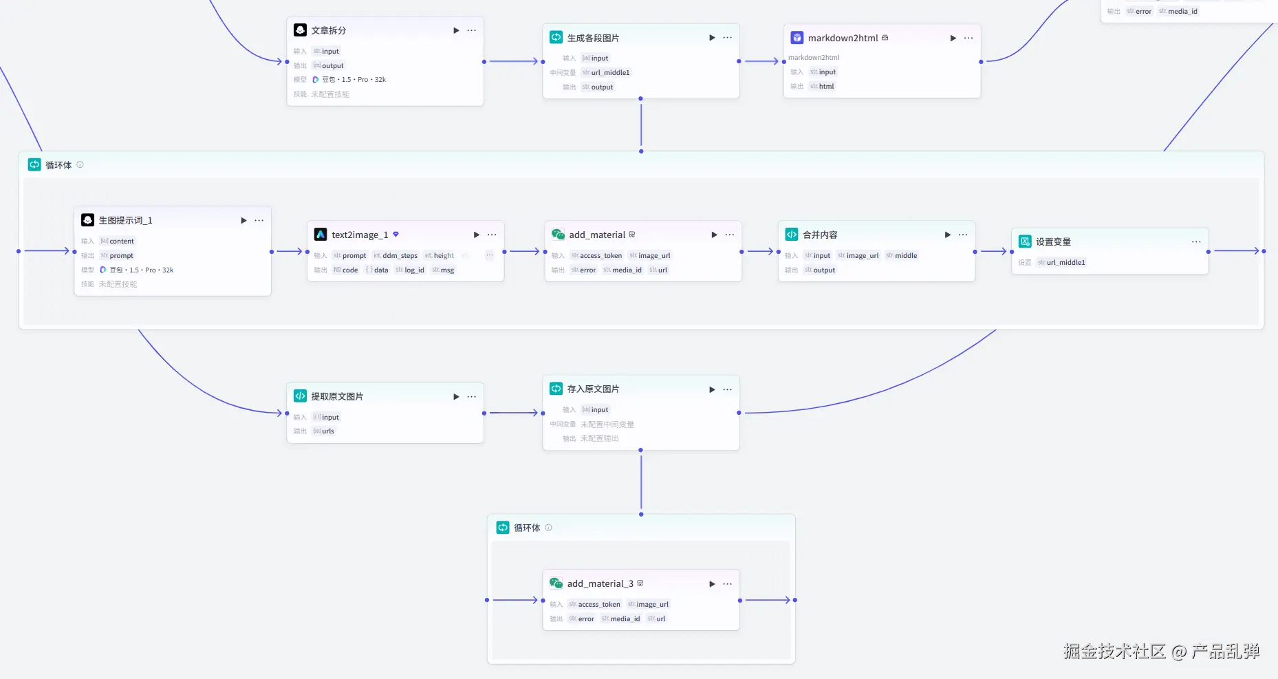 添加【循环】节点,将前一个节点输出的数组(各个分段内容)依次传入循环体中。按下图设置,设置中间变量 url_middle,作用是暂存已生成图片的段落,初始值为空(空格),并且输出变量也为 url_middle。3、生图图提示词、文生图插件、将封面传入公众号素材库