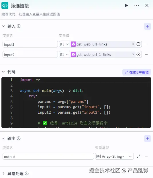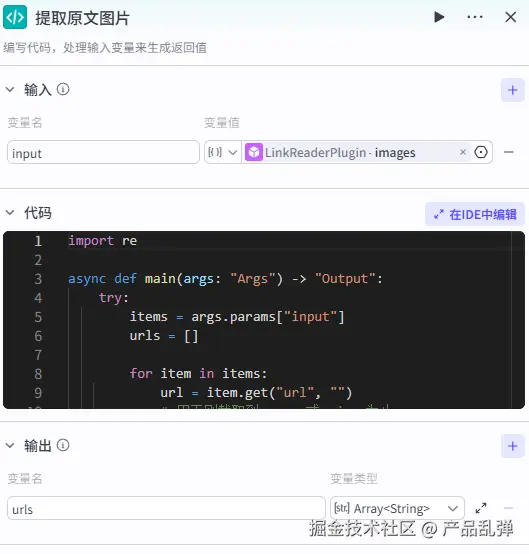 我们需要添加【代码】节点,输入为 LinkReaderPlugin 的 image 数组。源码