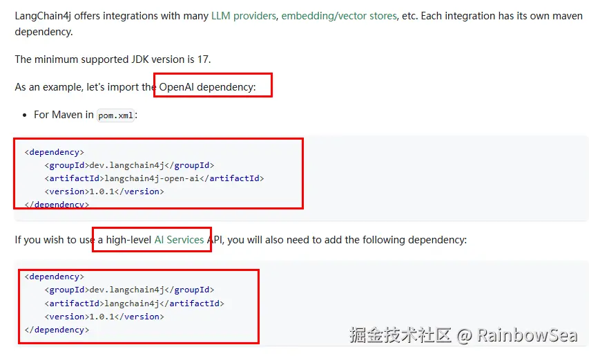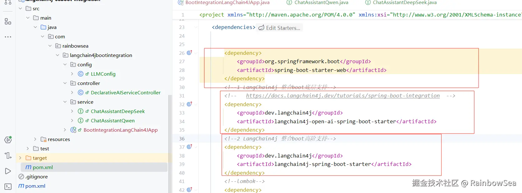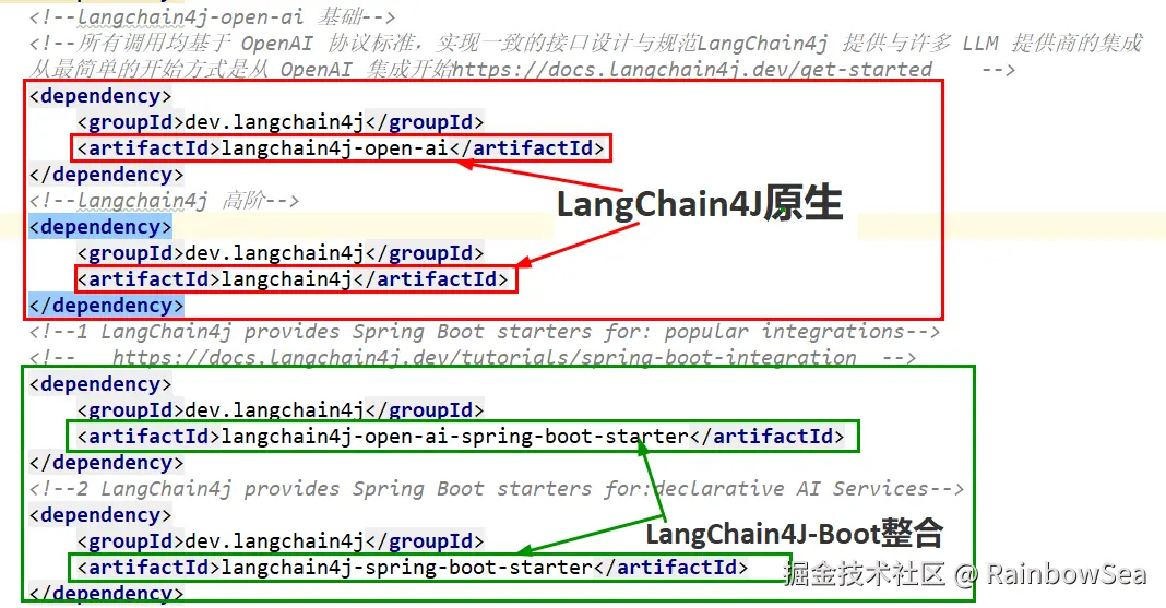 - 导入相关的 pom.xml 的依赖,这里我们采用流式输出的方式,导入 整合 Spring Boot ,`langchain4j-open-ai-spring-boot-starter,langchain4j-spring-boot-starter 这里我们不指定版本,而是通过继承的 pom.xml 当中获取。