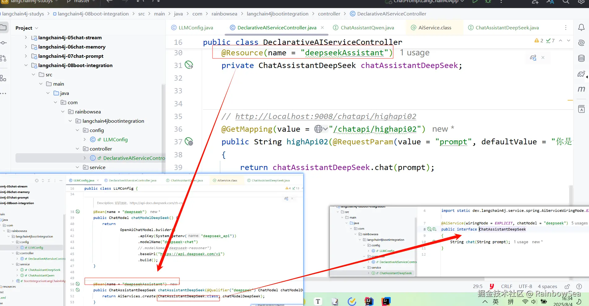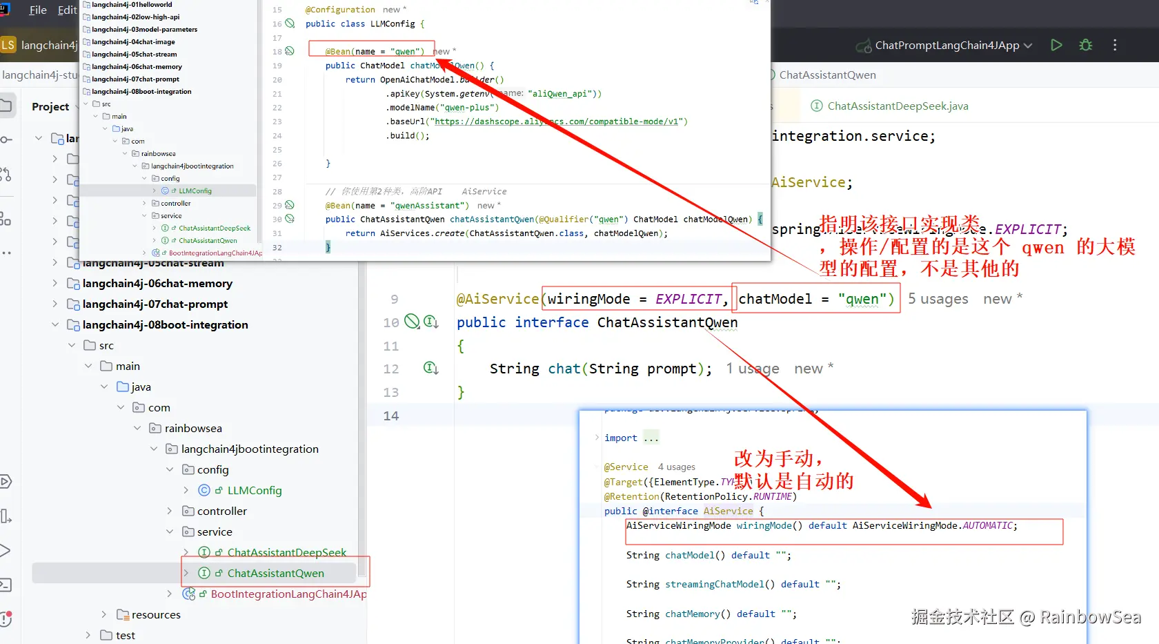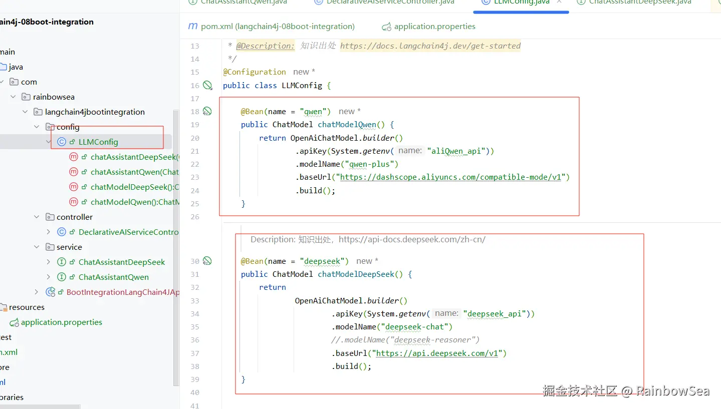 - 编写我们操作两个大模型的将接口类,同时通过在我们的配置类上 + 通过 @AiService 进行一个对接口的实现。