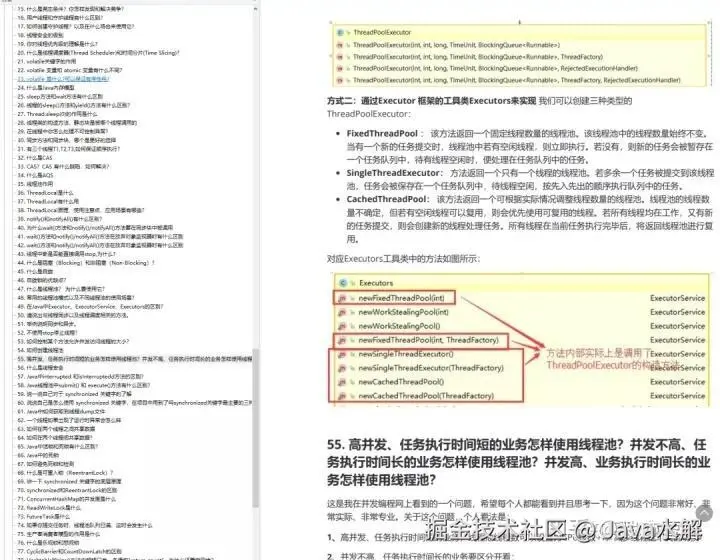 44. 创建线程池有哪几种方式? ①. newFixedThreadPool(int nThreads)创建一个固定长度的线程池,每当提交一个任务就创建一个线程,直到达到线程池的最大数量,这时线程规模将不再变化,当线程发生未预期的错误而结束时,线程池会补充一个新的线程。②. newCachedThreadPool()创建一个可缓存的线程池,如果线程池的规模超过了处理需求,将自动回收空闲线程,而当需求增加时,则可以自动添加新线程,线程池的规模不存在任何限制。③. newSingleThreadExecutor()这是一个单线程的 Executor,它创建单个工作线程来执行任务,如果这个线程异常结束,会创建一个新的来替代它;它的特点是能确保依照任务在队列中的顺序来串行执行。④. newScheduledThreadPool(int corePoolSize)创建了一个固定长度的线程池,而且以延迟或定时的方式来执行任务,类似于 Timer。