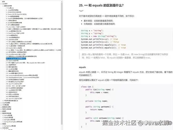 2. == 和 equals 的区别是什么? == 对于基本类型来说是值比较,对于引用类型来说是比较的是引用;而 equals 默认情况下是引用比较,只是很多类重新了 equals 方法,比如 String、Integer 等把它变成了值比较,所以一般情况下 equals 比较的是值是否相等。