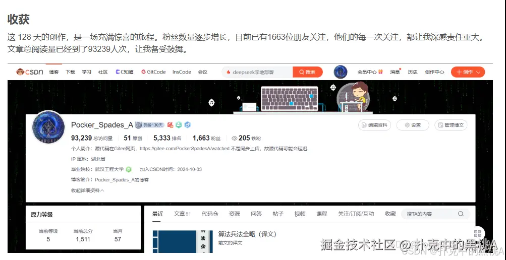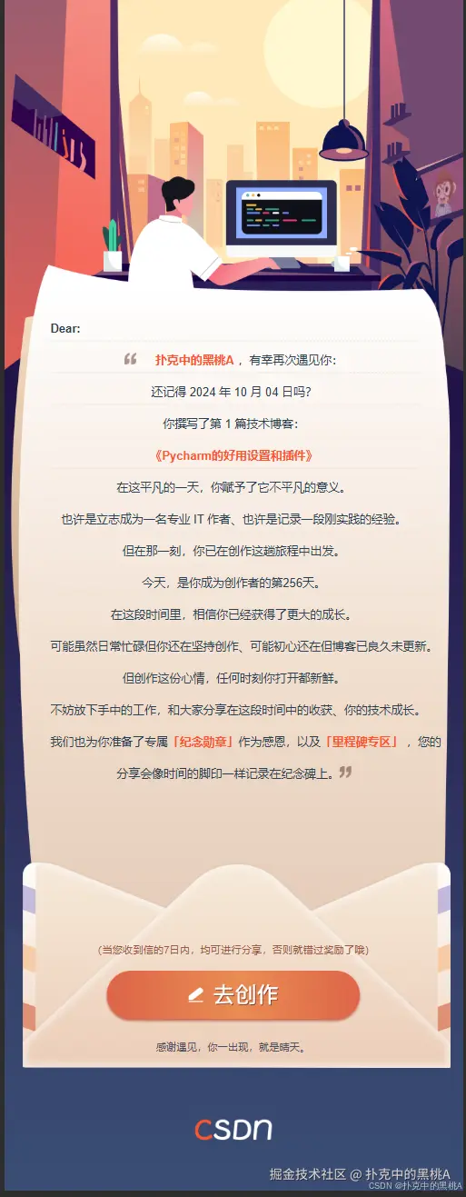 当鼠标点击 “发布” 按钮的那一刻,距离我在 CSDN 写下第一篇博客《Pycharm 的好用设置和插件》已经过去了 256 天。如果说 128 天是创作旅程的起点,那么此刻的我更像是站在技术成长的半山腰,回望来时的路,每一步都刻着代码的温度与社区的回响。这封报告不仅是对 256 天创作历程的复盘,更是一次与技术、与自我、与社区的深度对话。
