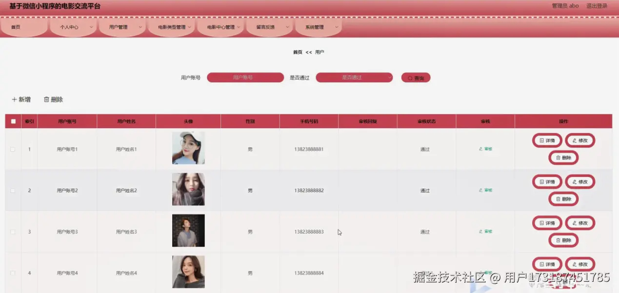 用户管理,在用户管理页面可以对索引、用户账号、用户姓名、头像、性别、手机号码、审核回复、审核状态、审核等内容进行详情、修改或删除等操作,如图4-9所示。