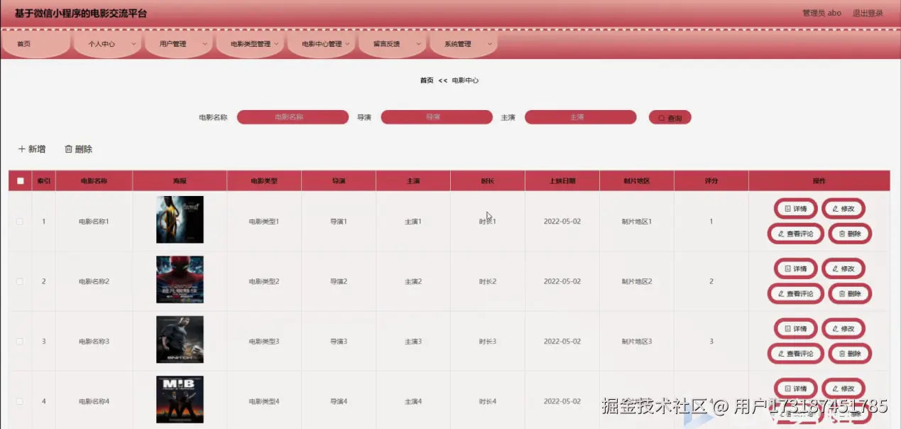 电影中心管理,在电影中心管理页面可以对索引、电影名称、海报、电影类型、导演、主演、时长、上映日期、制片地区、评分等内容进行详情,修改,查看评论或删除操作,如图4-11所示。