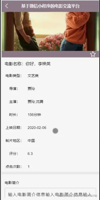 电影中心,在电影中心页面可以查看电影名称、电影类型、导演、主演、封面、时长、上映日期、制片地区、评分、点击次数、电影简介等信息,并根据需要进行评论或收藏操作;如图4-4所示。