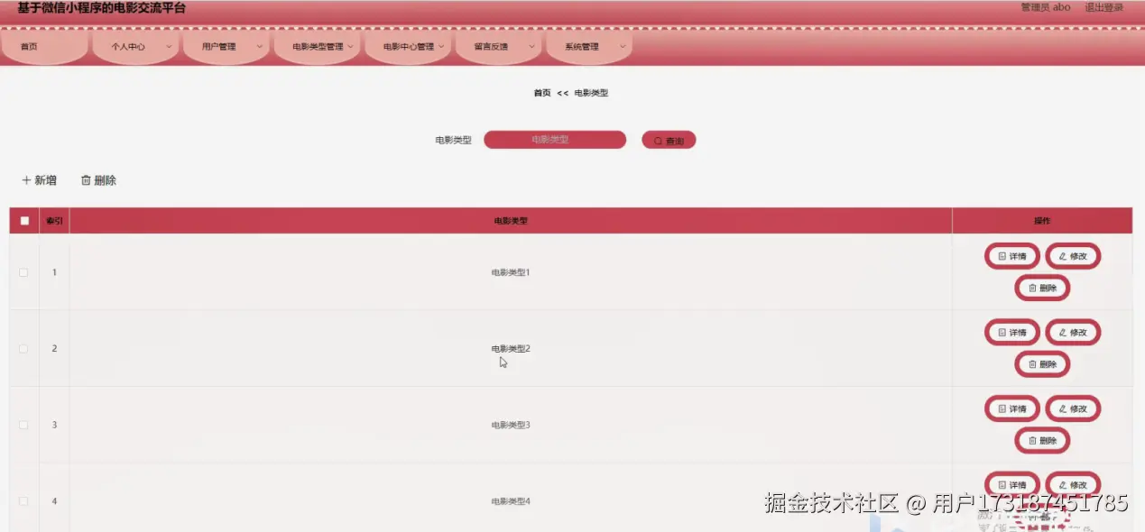 电影类型管理,在电影类型管理页面可以对索引、电影类型等内容进行详情,修改或删除操作,如图4-10所示。