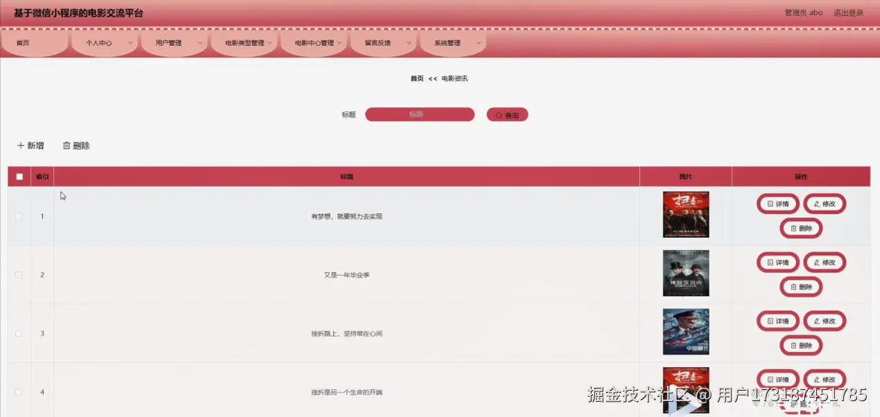 系统管理,在电影资讯页面可以对索引、标题、图片等内容进行详情,修改或删除等操作,还可以对轮播图管理进行详细操作;如图4-13所示。