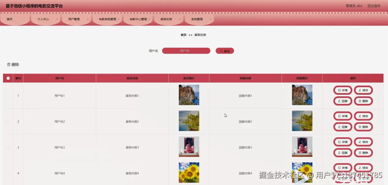 留言反馈,在留言反馈页面可以对索引、用户名、留言内容、留言图片、回复内容、回复图片等内容进行详情,修改,回复和删除操作,如图4-12所示。